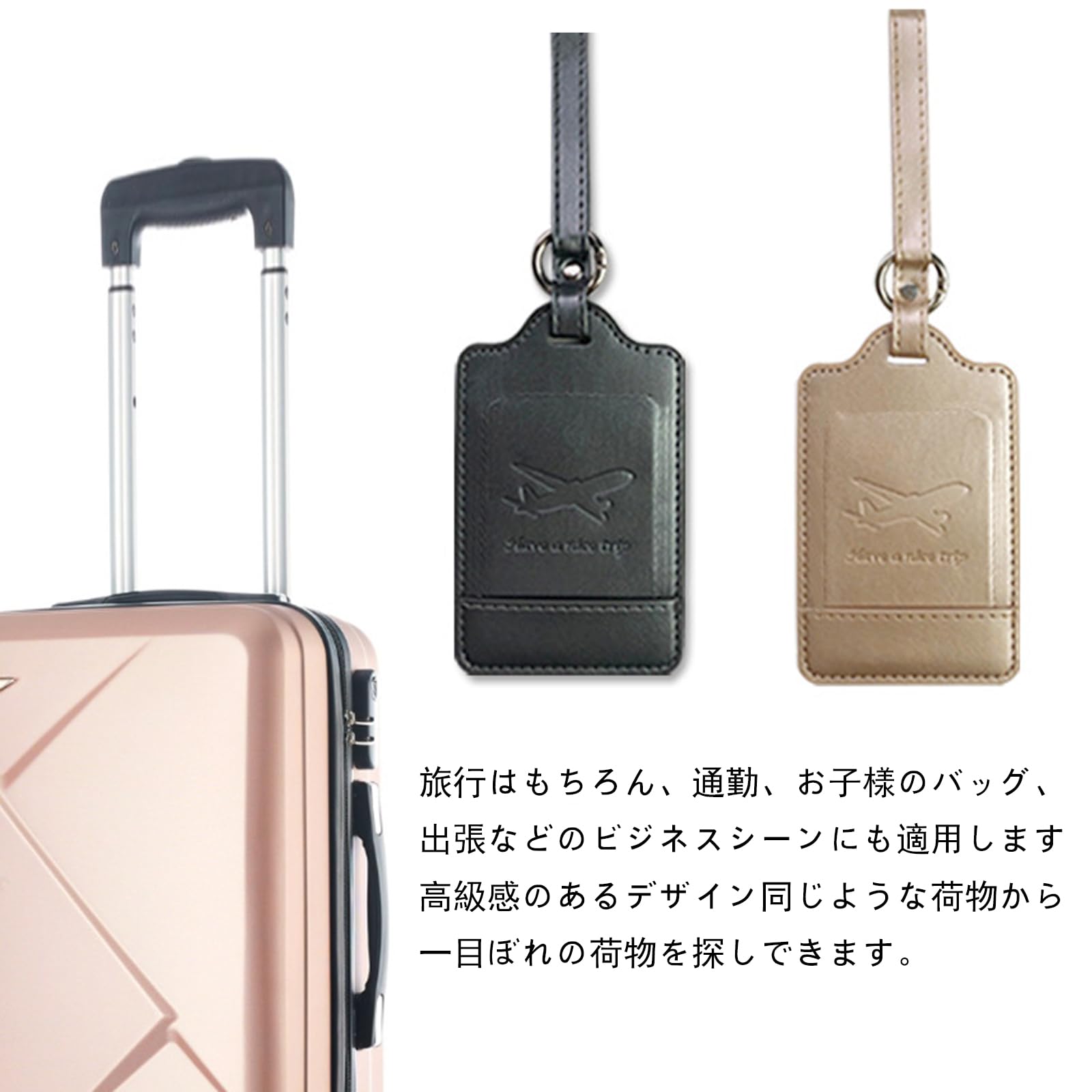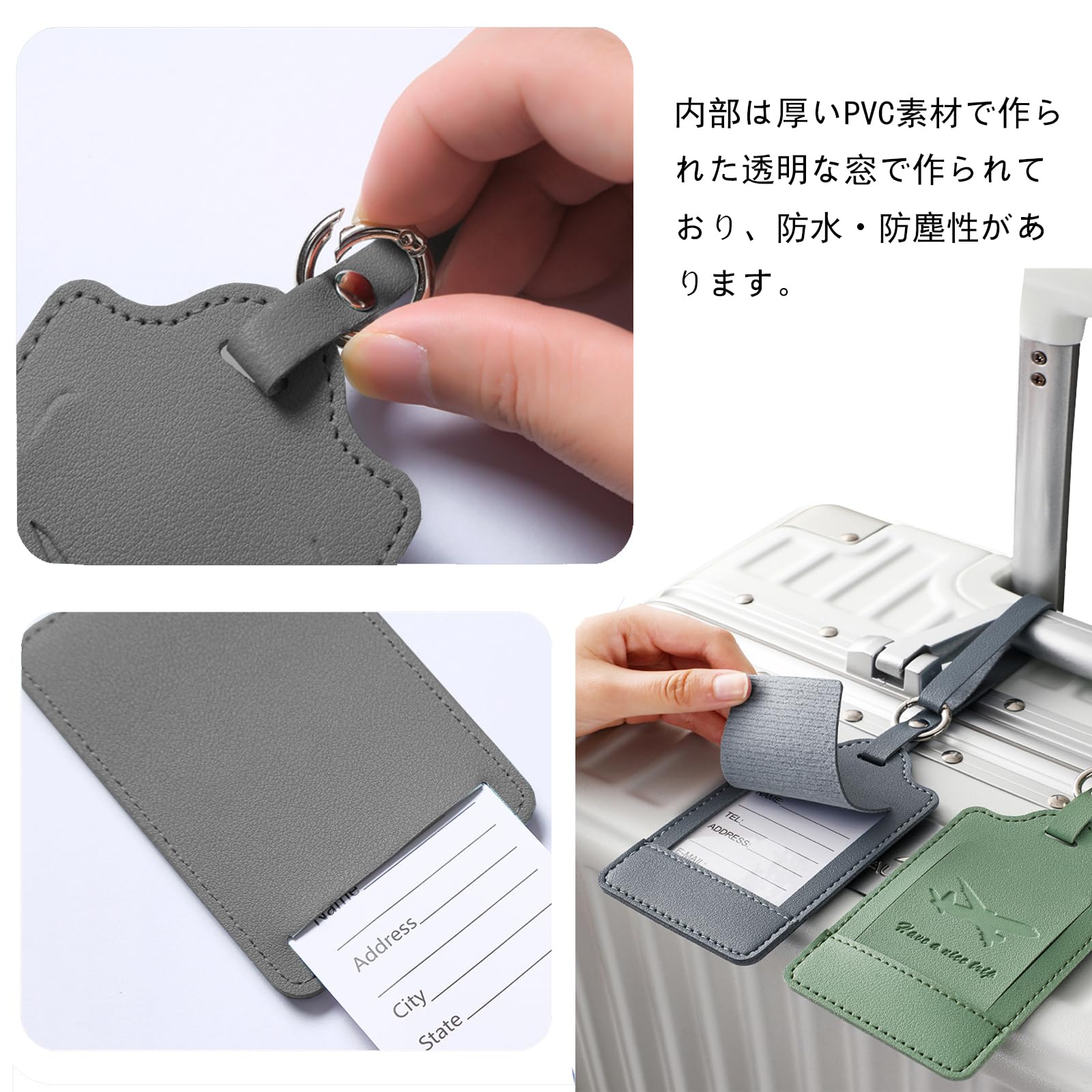 【取り付けが簡単】荷物タグと同じ色のベルトが付いており、スプリングリングを押し、ネームタグを 簡単に取り外しができます。本当に便利でシンプルで巧妙なデザインです。