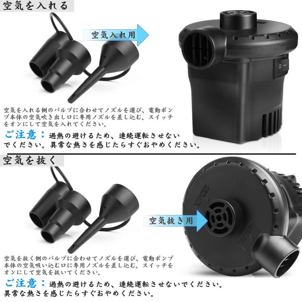 【使いかた】専用ノズル付きます。『空気を入れる』:1.空気を入れる側のパルプに合わせてノズルを選び、電動ポンプ本体の空気吹き出し口に専用ノズルを差し込む。2.電源プラグをコンセントに差し込む。 3.スイッチの「I」を押すと、操作が始まります。『空気を抜く』:1.空気を抜く側のパルプに合わせてノズルを選び、電動ポンプ本体の空気吸い込む口に専用ノズルを差し込む。2.電源プラグをコンセントに差し込む。 3.スイッチの「I」を押すと、操作が始まります。