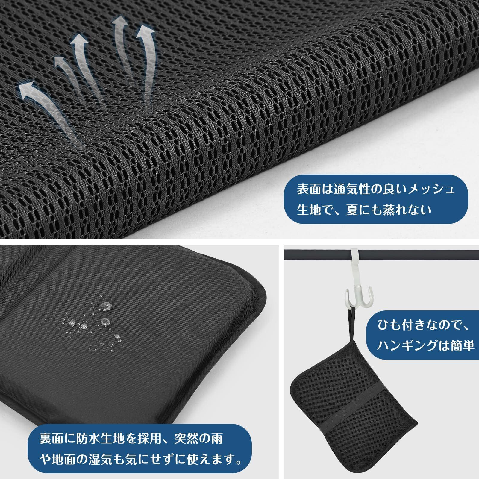 【通気性と防水性を兼ね備えた生地】表面は通気性の良い3Dメッシュ生地を採用しており、夏場のムレを防ぎます。裏面は防水生地で、朝露や水たまりの上でも安心して使用できます。突然の雨や地面の湿気も気にせず、快適にご利用いただけます。
