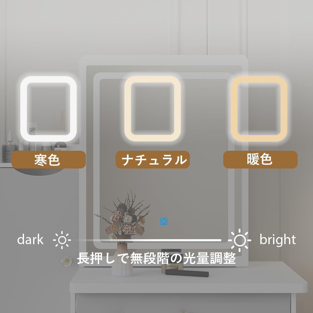 【3色LEDライト】この白いドレッサーセットは、インテリジェントなLEDミラーがついていて、ワンタッチで暖色、白色、寒色の3色を切り替えて、長押しで明るさを無階段に調整できる便利の機能を備えていて、夜や曇りの日にメイクやヘアをするのに便利です。