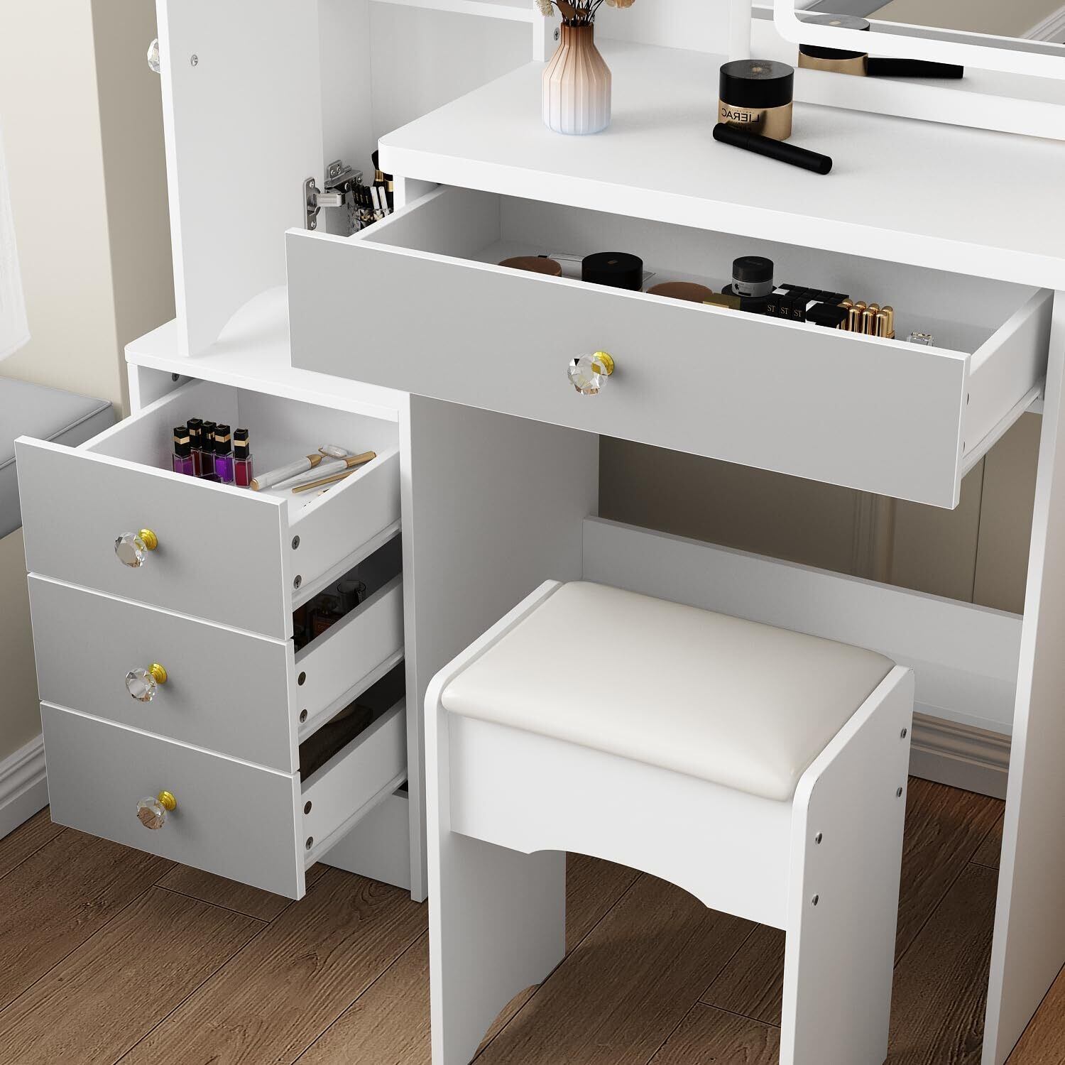 【十分な収納スペース】引き出し、オープン棚、天板、多種の収納スペースを備えていて、様々な収納ニーズに満足できます。化粧品、メイク道具、ジュエリー、香水、写真などを収納するのに十分なスペースがあります。