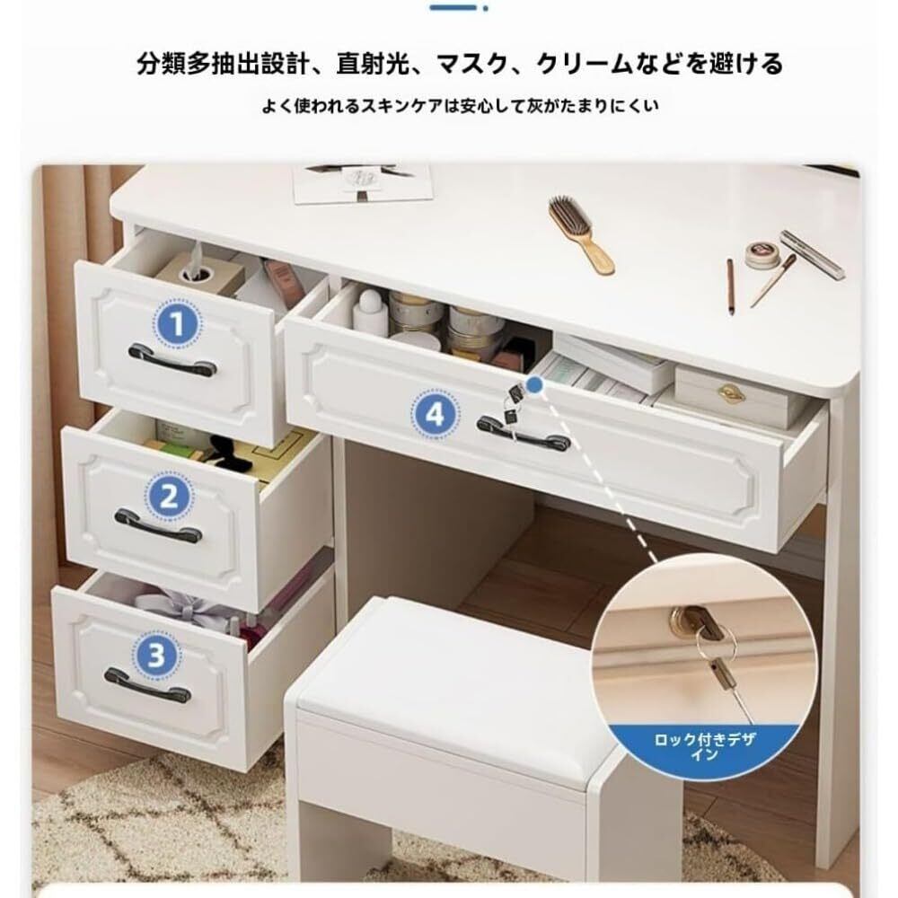 バニティテーブルは高品質のMDF合成木材ボードで作られており、安定性と耐久性を確保しています。 収納を合理的に分類し、ごちゃごちゃを捨て、収納をより便利にします。 3段階の明るさ調節可能。