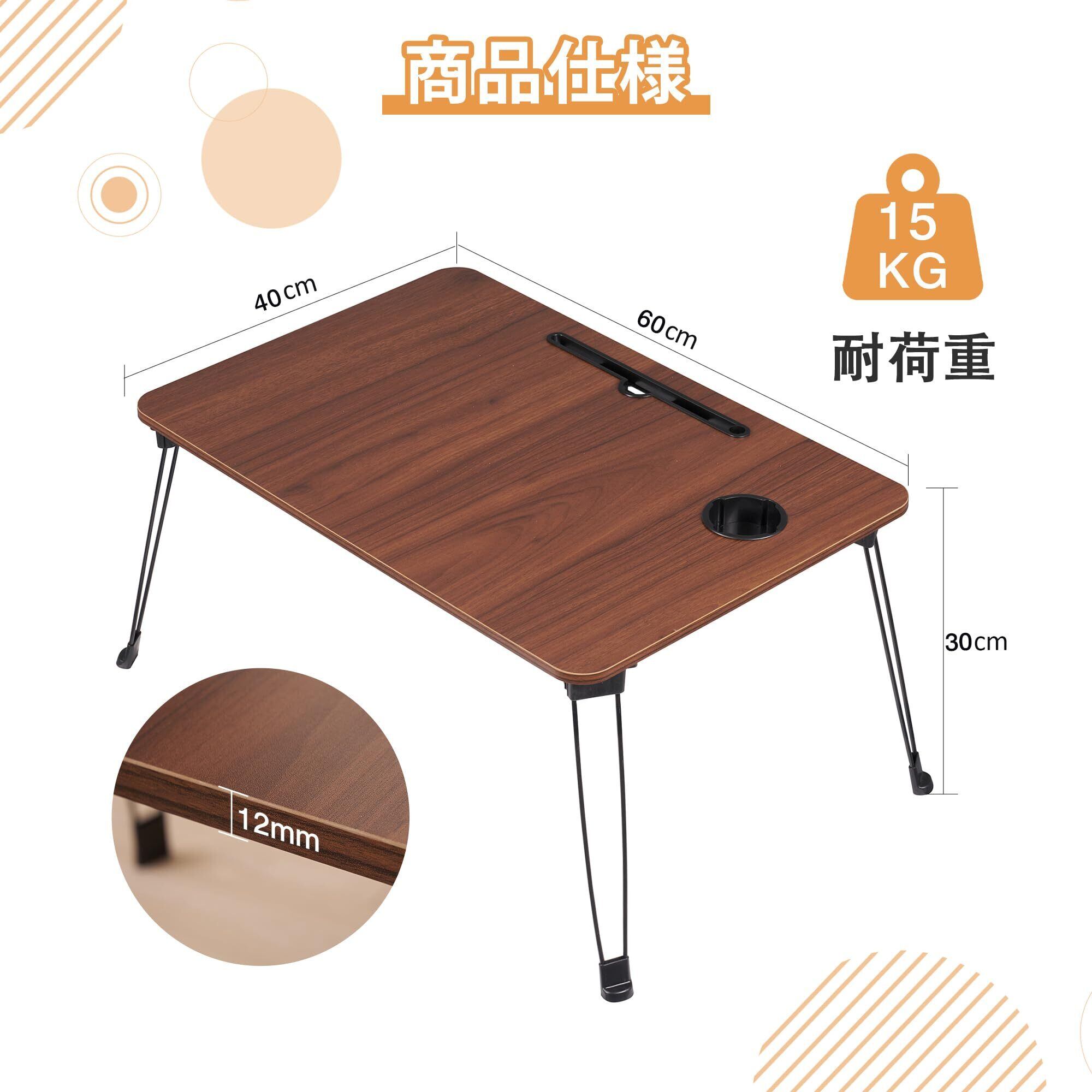 【製品仕様】(サイズ):幅60×奥行40×高さ30cm;折りたたんだ厚み:約5cm;(本体重量):2.4kg;(耐荷重):15kg;(材質):天板/HDF木製、脚部/スチール。※組み立て不要。届いたらすぐ使えます。