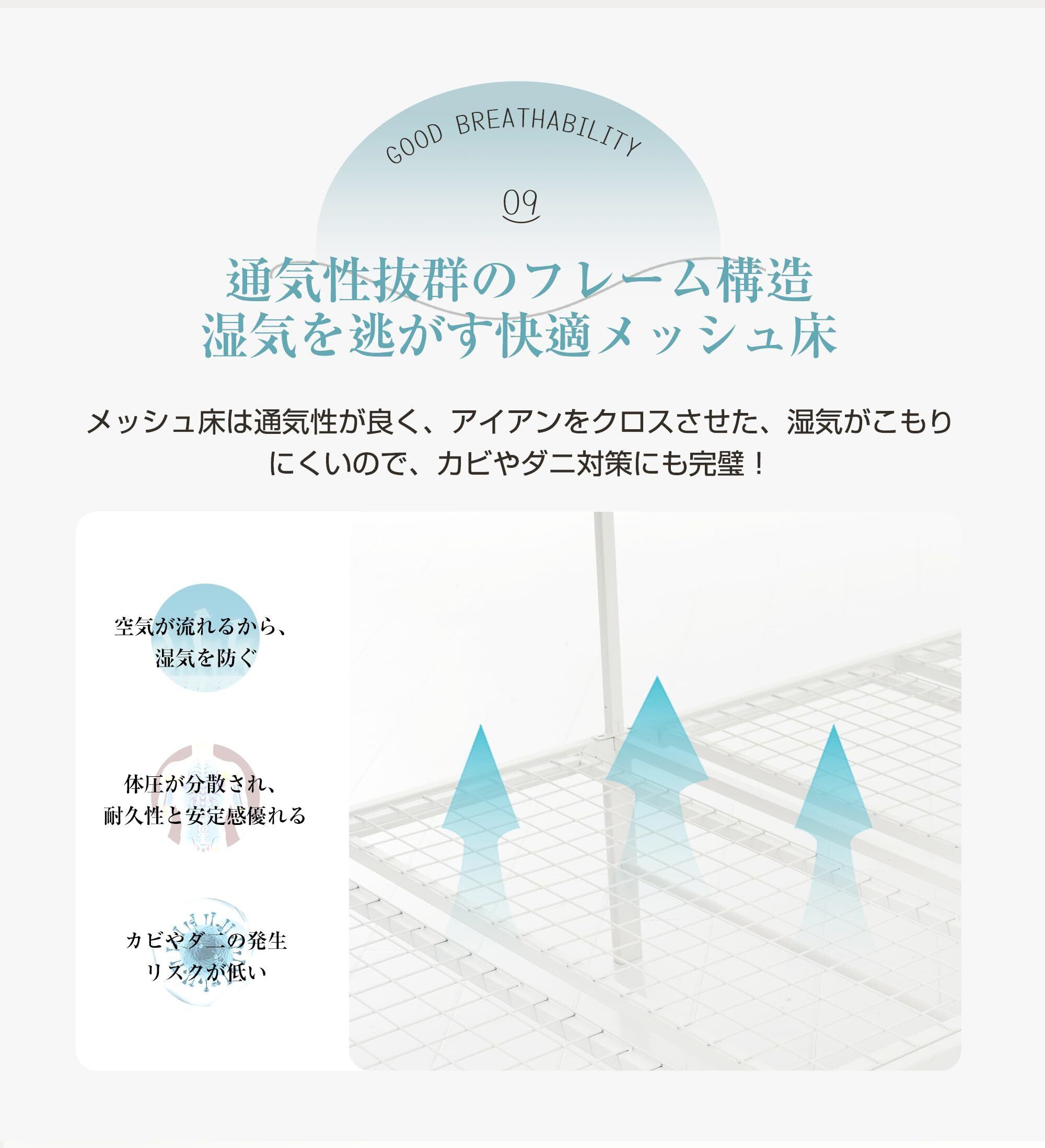 【通気性・清潔性にも配慮】メッシュ床とクロス構造により通気性を確保し、湿気がこもりにくくカビやダニの発生を防止。長期間快適に使える衛生的な設計です。