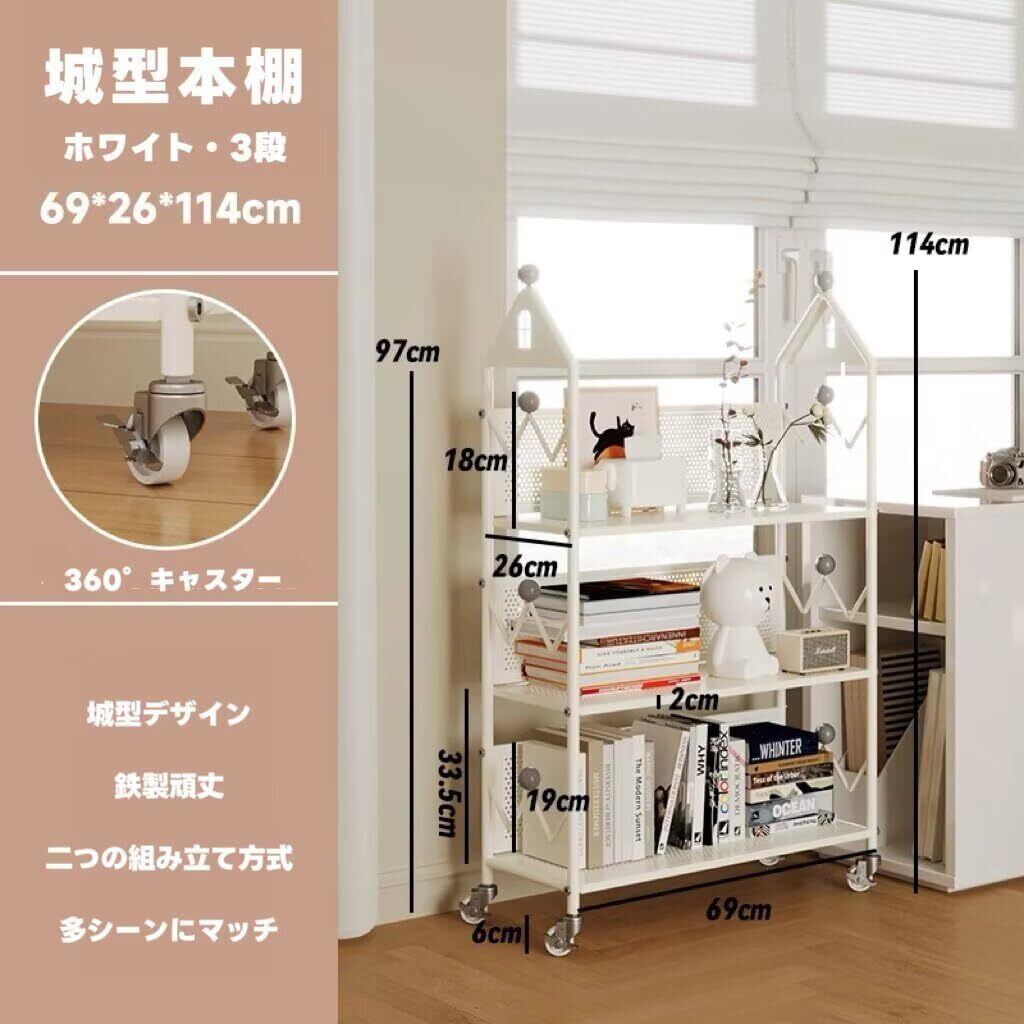 SwiftLink 本棚 ファイルワゴン ファイルラック 移動式本棚 キッズ用収納ラック キャスター付き 3段 防錆鉄製 省スペース 多目的 ホワイト シンプルデザイン 69*26*114cm
