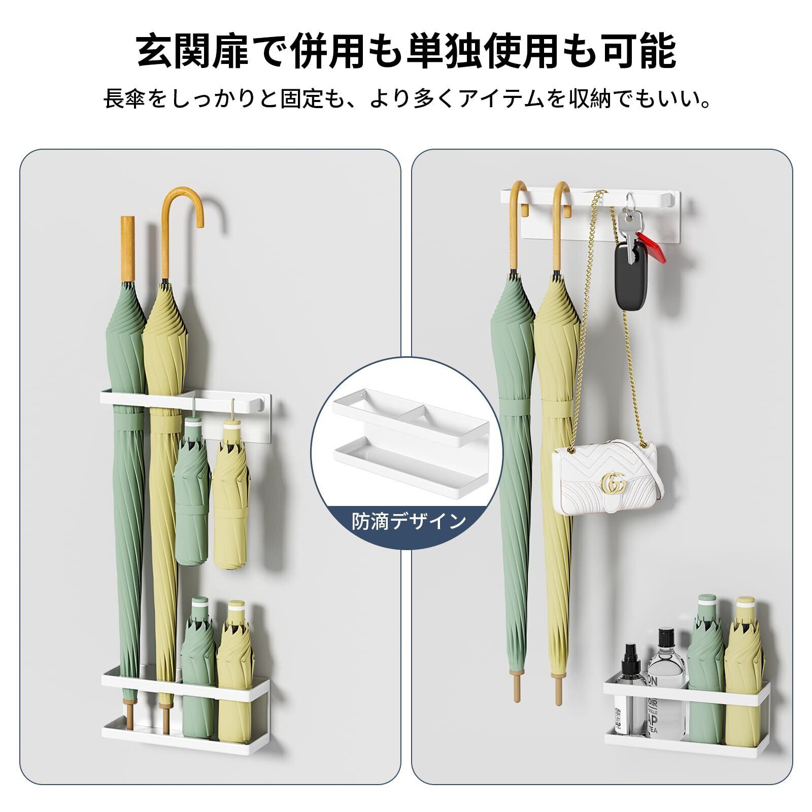 【マグネット傘立て】玄関のドアに取り付けて、傘を簡単に収納できます。ラックは防滴設計で、水が流れて床が濡れる心配もありません。鍵やタオルを簡単に整理できる吊り棚も付いています。これさえあれば、玄関ホールがすっきりきれいになります。