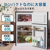 【コンパクト・大容量】 長さ49cm、幅45cm、高さ84cm、占地面積わずか0.14畳、総容量95L(冷凍室28L、冷蔵室67L)。 ●1~2人暮らし向け。 コンパクトなのに様々な食材をたっぷり入れたり、簡単に収納したりすることができます。 ●場所に拘らずに、キッチンや寝室、リビングを最大限に活用できます。 限られたスペースでも手詰まりに感じさせません。