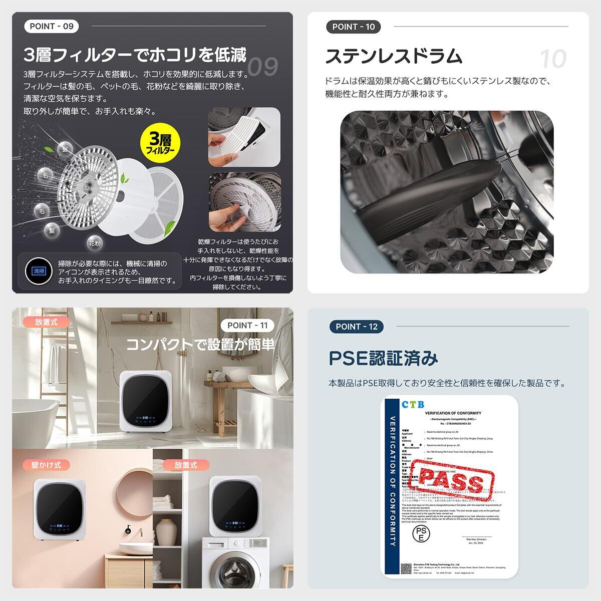 【新春セール】Kennkari 衣類乾燥機 小型 3kg 靴専用トレー付き 乾燥機 壁掛け 家庭用 タイマー ドラム式 一人暮らし コンパクト 衣類 洋服 乾燥 高温除菌 除湿 梅雨 工事不要 (ホワイト:タッチパネル操作) | Cherry Blossoms