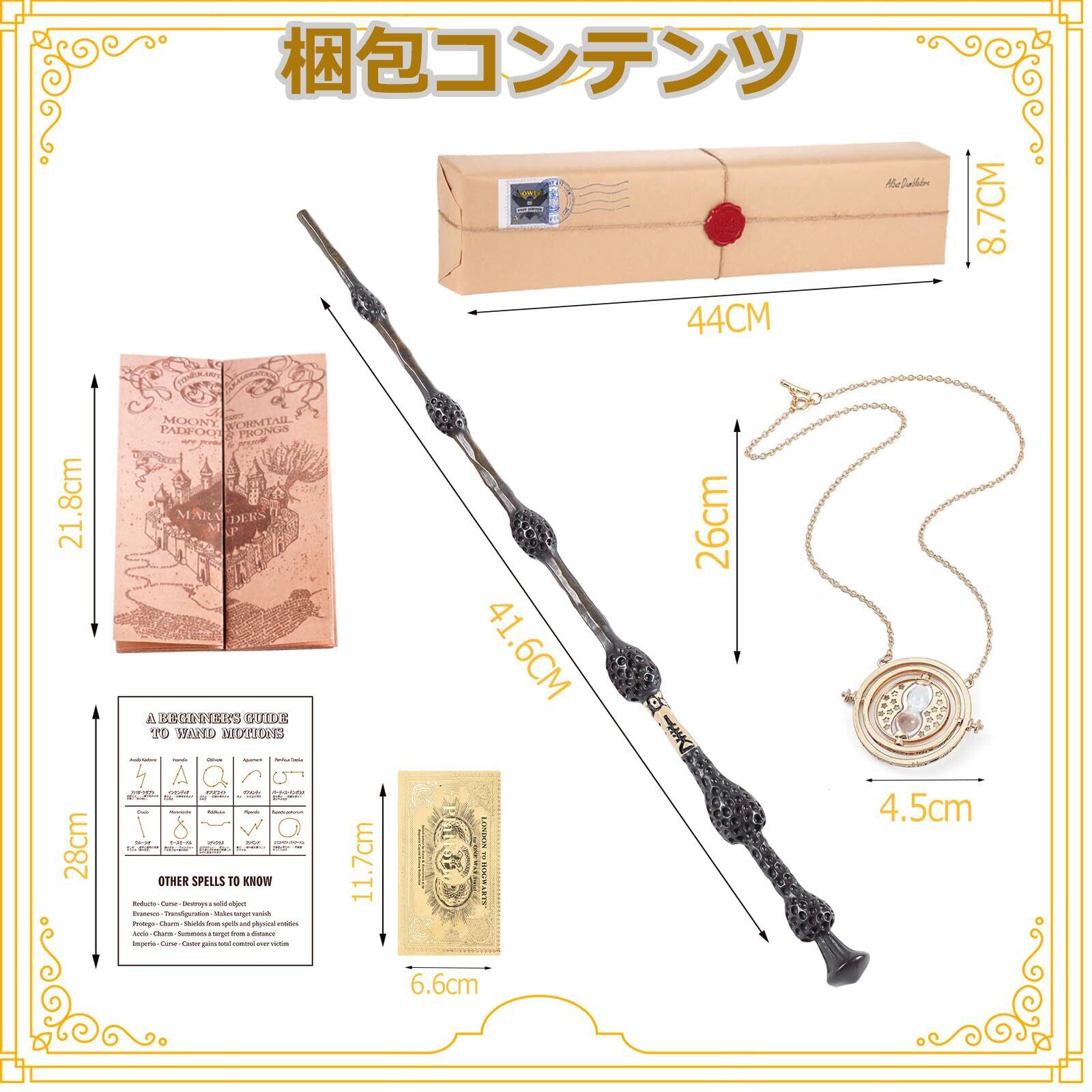 内容物: 杖、マジックマップ、タイムコンバーターネックレス、呪文リスト、チケット、ギフトボックス、。お友達やご家族へのギフトにも最適です。