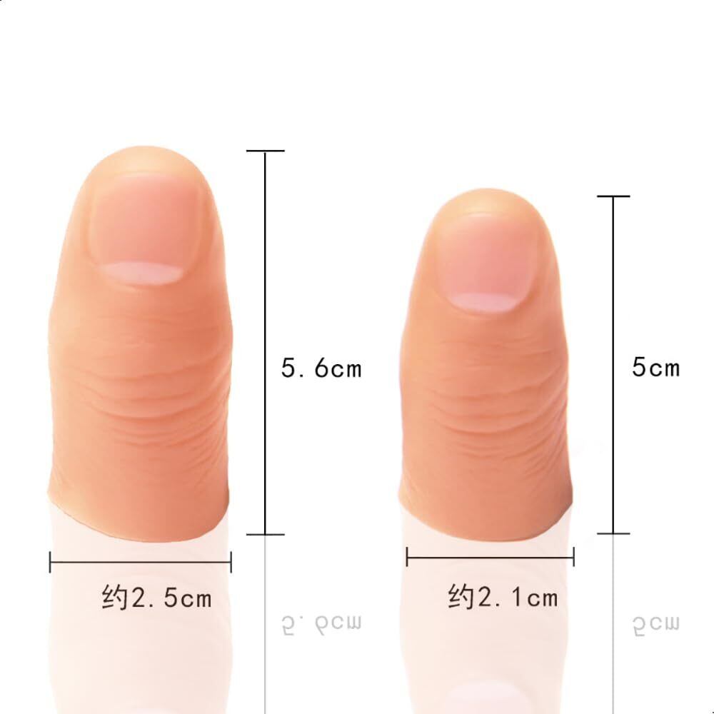**2. 【サイズがフィットし、広く適用される】 ほとんどの親指と指のために設計されており、大親指の長さは5.5 cm、内径は2.5 cm、小指の長さは5 cm、内径は2 cmで、さまざまな手型にぴったりフィットしています。大人でも子供でも、気軽に身につけてマジックを楽しむことができます。肌の色は親指のようなデザインで、よりリアルで自然で、マジックショーにリアリティを加えています。