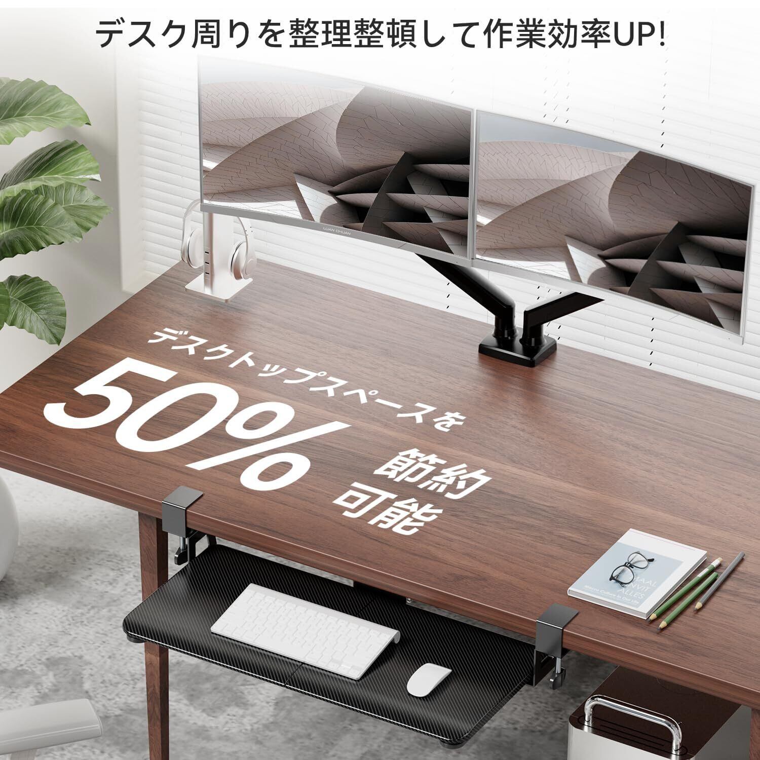 【便利なスライド式-生産性を向上させるデスクエクステンダー!】 棚部分は約762*300*95mmあるので、市販されているすべて業務/ゲーム用キーボードに完璧にフィットています。マウスやヘッドセットなどの周辺機器を置いても余裕がある広さです。不要なときは、邪魔にならないように引き出しレールで机下にすっきり収納できます。スライドレールは非常に滑らかで軽い力でスムーズに引き出すことができ、耳障りな異音もありません。キーボードとマウスを机上に置かなくていいので、広々と書類や資料を広げて作業することができます。とくにゲームプレイ時には、素早い動きに対応してマウスを動かすことができます。KD10-CBキーボードトレイを有効利用してデスク周りの環境を整え、効率的に作業しましょう。