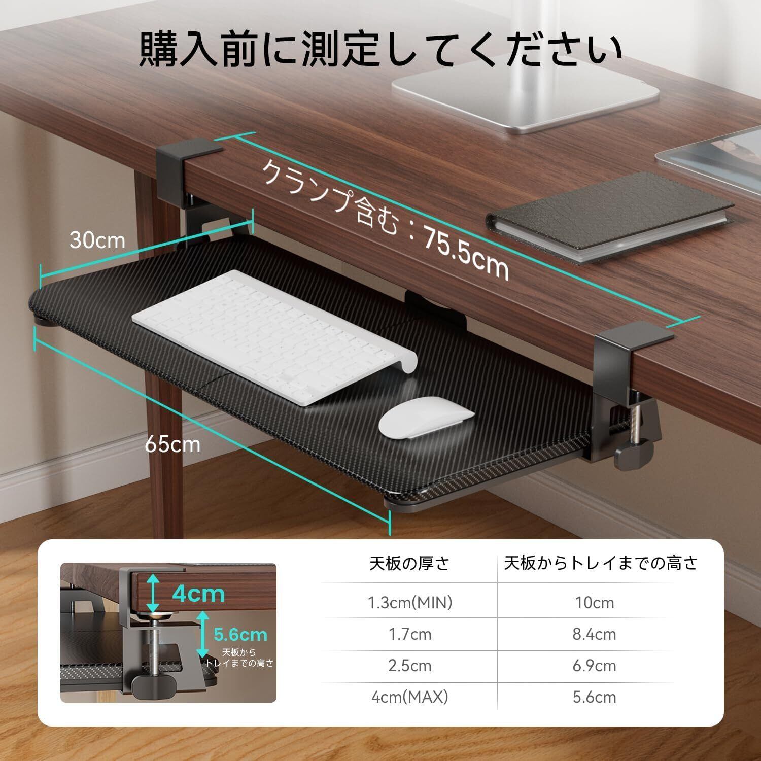 【C型クランプ式-穴あけ不要/初心者でも超簡単/子どもの安全性を守る】 キーボードが不安定だと、本当に困りますよね。調整可能なクランプは奥行きのないデスクにトレイをしっかりと固定します。また、クランプには傷防止・滑り止め用の柔らかいフォームパッド付きです。日本語の組み立て手順書が付属しており、複雑な操作はなく、ドライバー1本で取り付け可能!注意:コーナー/面取り/スカート付き/引き出し付きデスク(厚さ約40-12.7mm)には適していません。キーボードトレイの四隅に特殊な加工を施し、円弧状を採用しています。特に、小さなお子様が家で遊んでいる時の怪我を防ぐことができます。