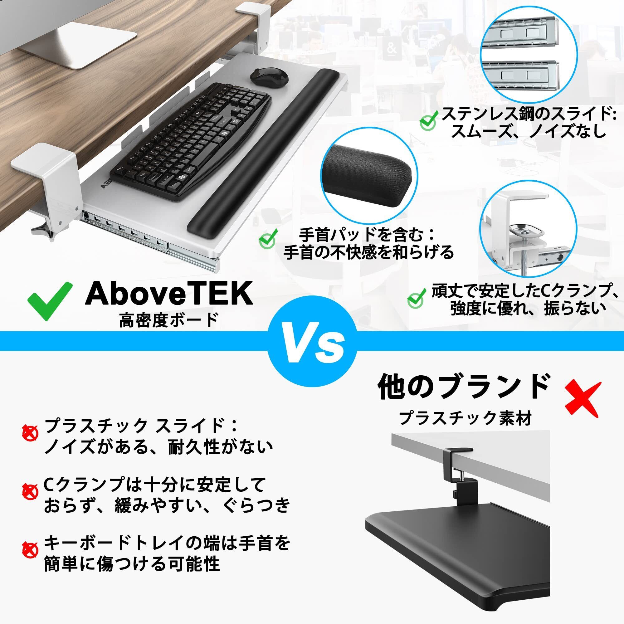 AboveTEK 大型キーボードスライダー 後付け キーボードスタンド リストレスト付き 頑丈なCクランプ式 キーボードトレイ デスクエクステンダー 肘置き台 デスク延長板 手首パッド 人間工学に基づいたデスクコンピュータ キーボード 台 キーボード デスク拡張 マウス収納可能 取り付けが簡単-白