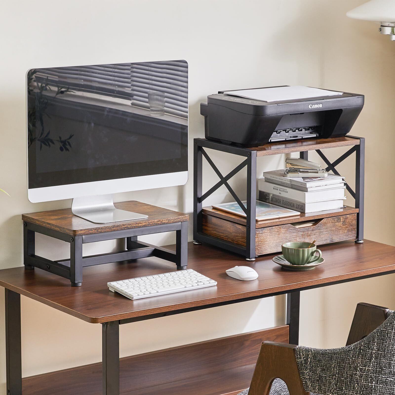 【おしゃれ&大容量ストレージ】ブラウンの収納ボードとブラックフレームのプリンターラックは、クラシックなデザインと現代的なトレンドが満載です。ストレージ付きのプリンタースタンドは、どんなオフィスや仕事場所でもモダンな雰囲気を演出してくれます。