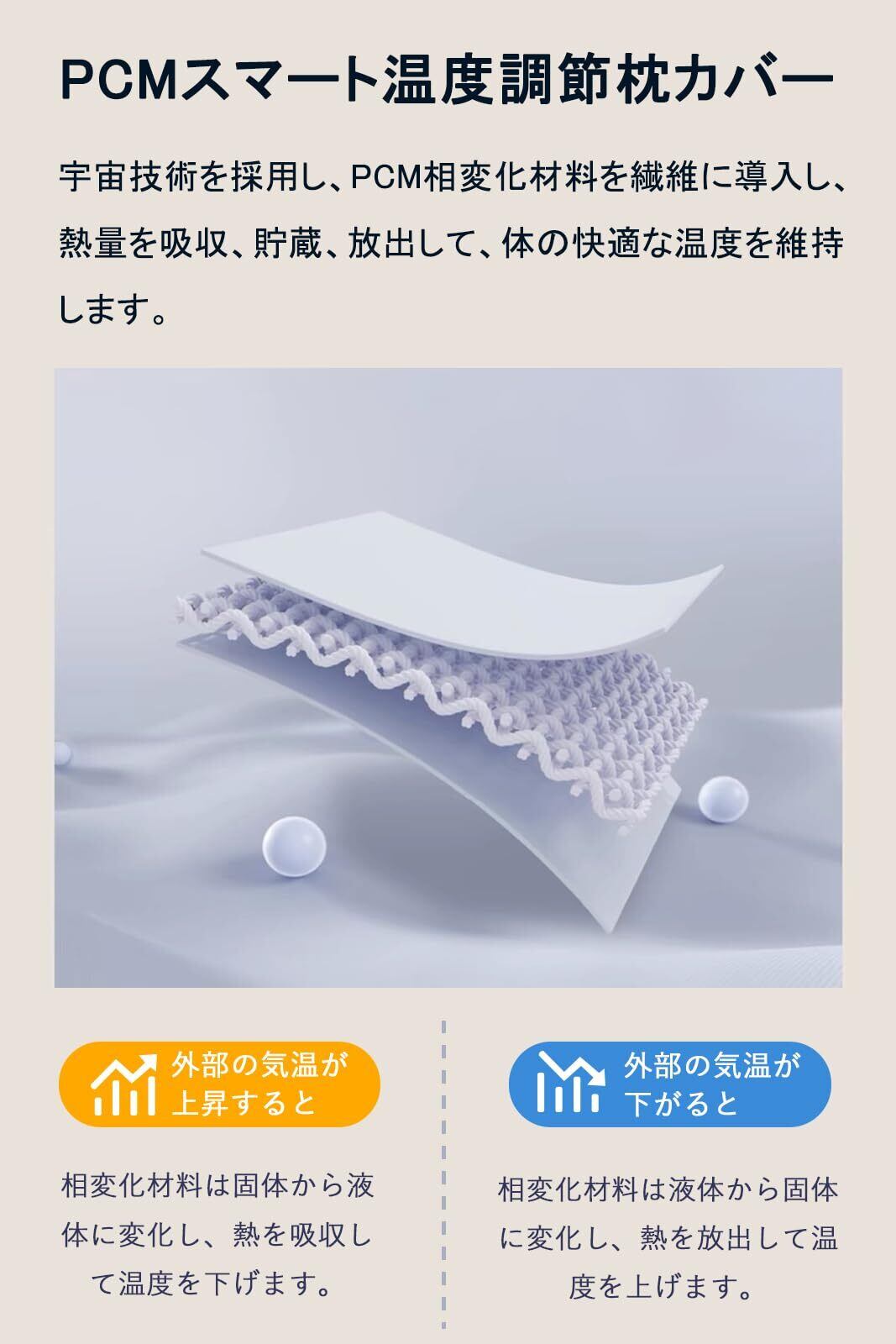 【一年中快適な睡眠を実現】枕カバーには最新の宇宙技術を応用したPCM相変化材料を使用。体温に合わせて熱を吸収・放出し、季節を問わず快適な眠りを実現します。