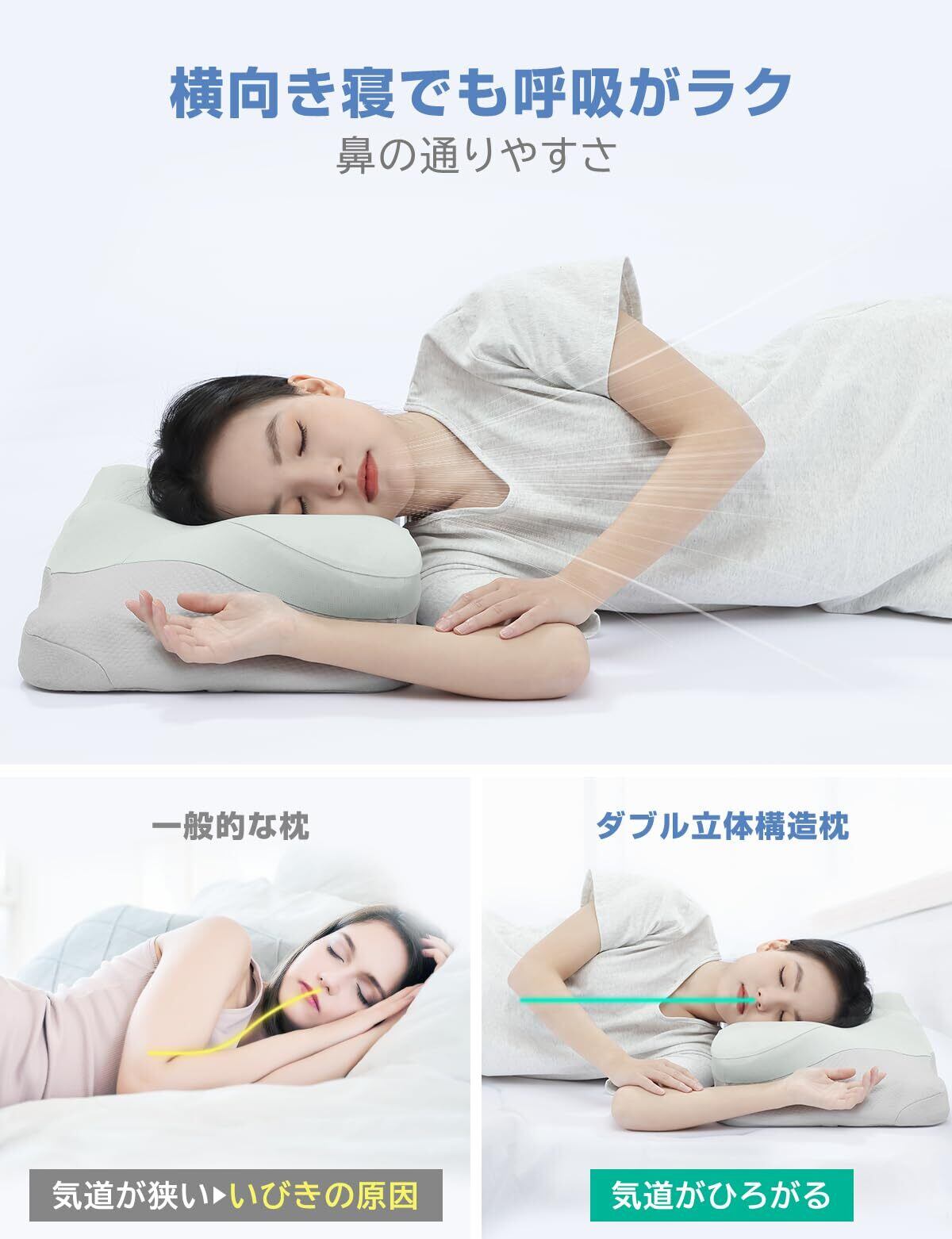 【スムーズな呼吸で快適な睡眠へ】軽やかに背骨を支えながら顎を持ち上げ、頭部を通常の枕よりやや高い位置にキープ。自然と呼吸しやすい姿勢を保ち、気道を確保。この まくら は横向きに寝ても呼吸がしやすく、息苦しさを感じにくい快適設計。