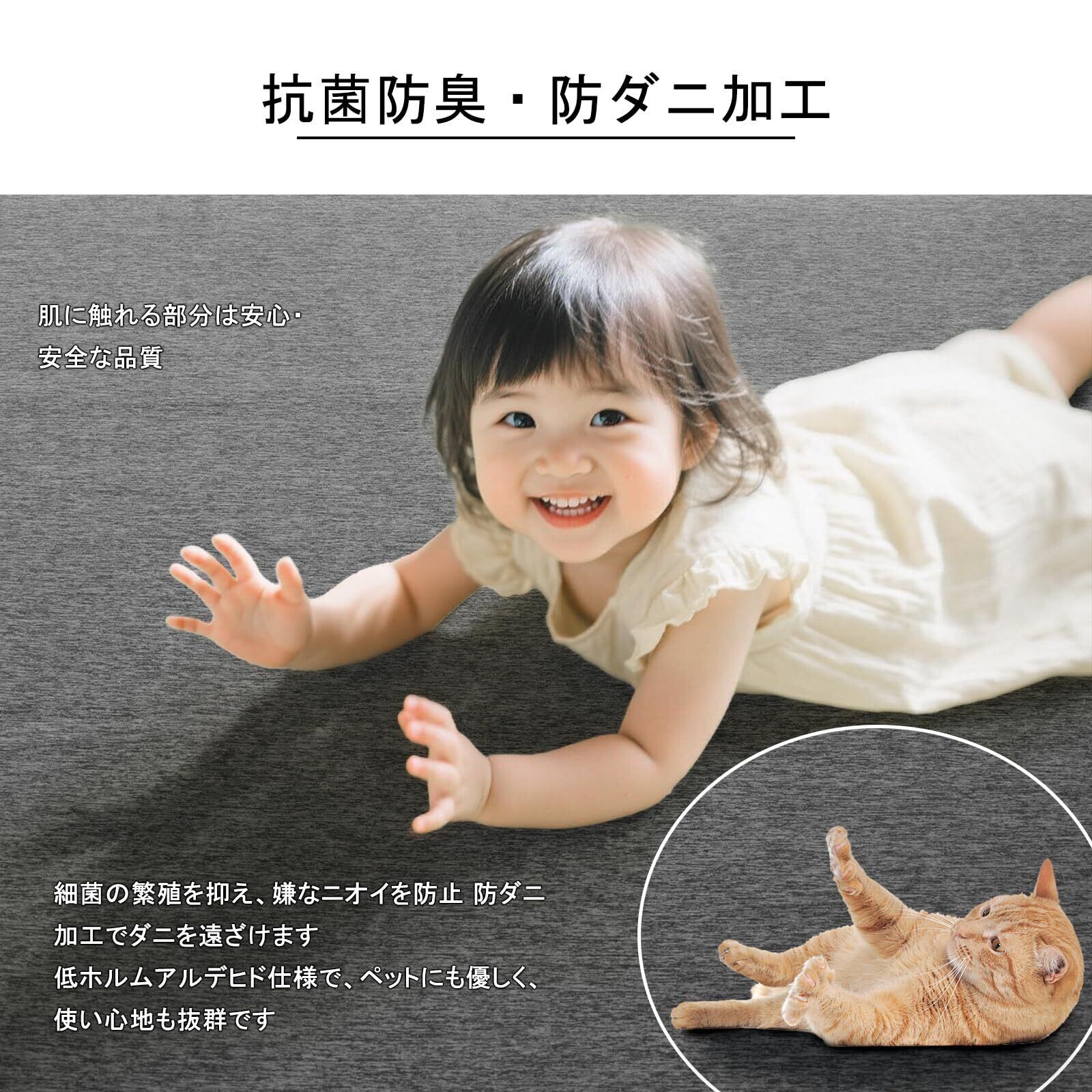 【抗菌防臭&安全設計・滑り止め加工付き】冷感ラグは低ホルムアルデヒド仕様でお子様やペットのいるご家庭でも安心。抗菌防臭加工が細菌の繁殖や嫌な臭いを抑制し、汗をかく季節も清潔に使用可能です。裏面には滑り止め加工を施し、フローリングなどの床にしっかり密着。転倒リスクを軽減し、安全にご利用いただけます