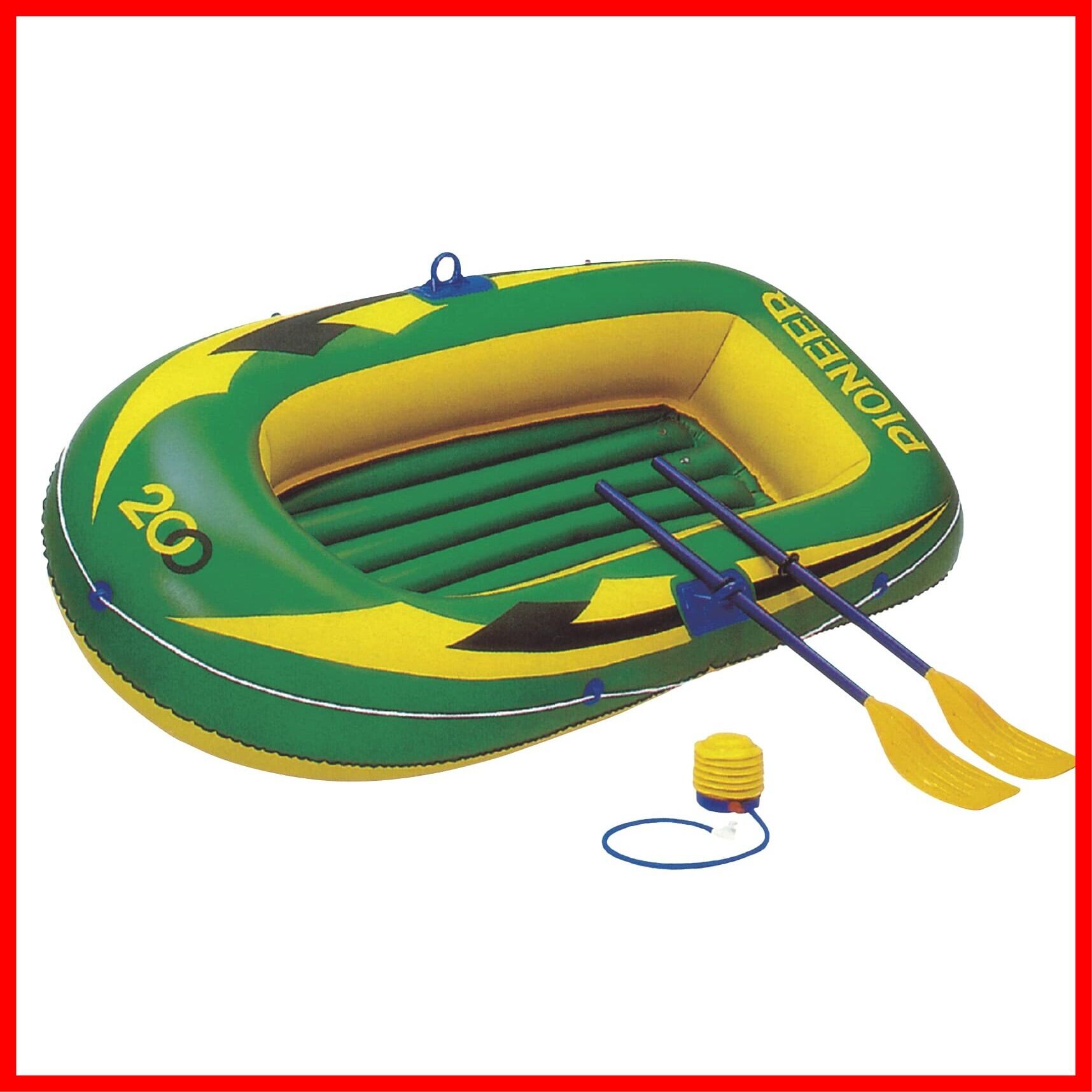 長さ約198センチの二人乗りビニールボートです。この商品にはボート本体以外に組み立て式オール2セットと膨らまし用足踏み式ポンプ1ヶがセットされています。大人1名子供1名の2名まで同時に乗ることが可能です。