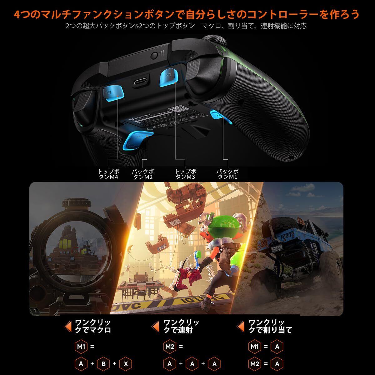 【6軸ジャイロセンサー】PCゲーミングコントローラーの「GYROCON+」テクノロジーにより、PC上のモーションエイミングゲームをサポートします。 Switchのモーションエイミング機能をオンにしないでください。 Switch はネイティブ モーション コントロールをサポートしています。 【4つのオンボードプロファイル】ワイヤレスゲームコントローラーは設定をどこにでも持ち運べ、Rainbow 2 Proを使用してあらゆる種類のゲームに対応できます。