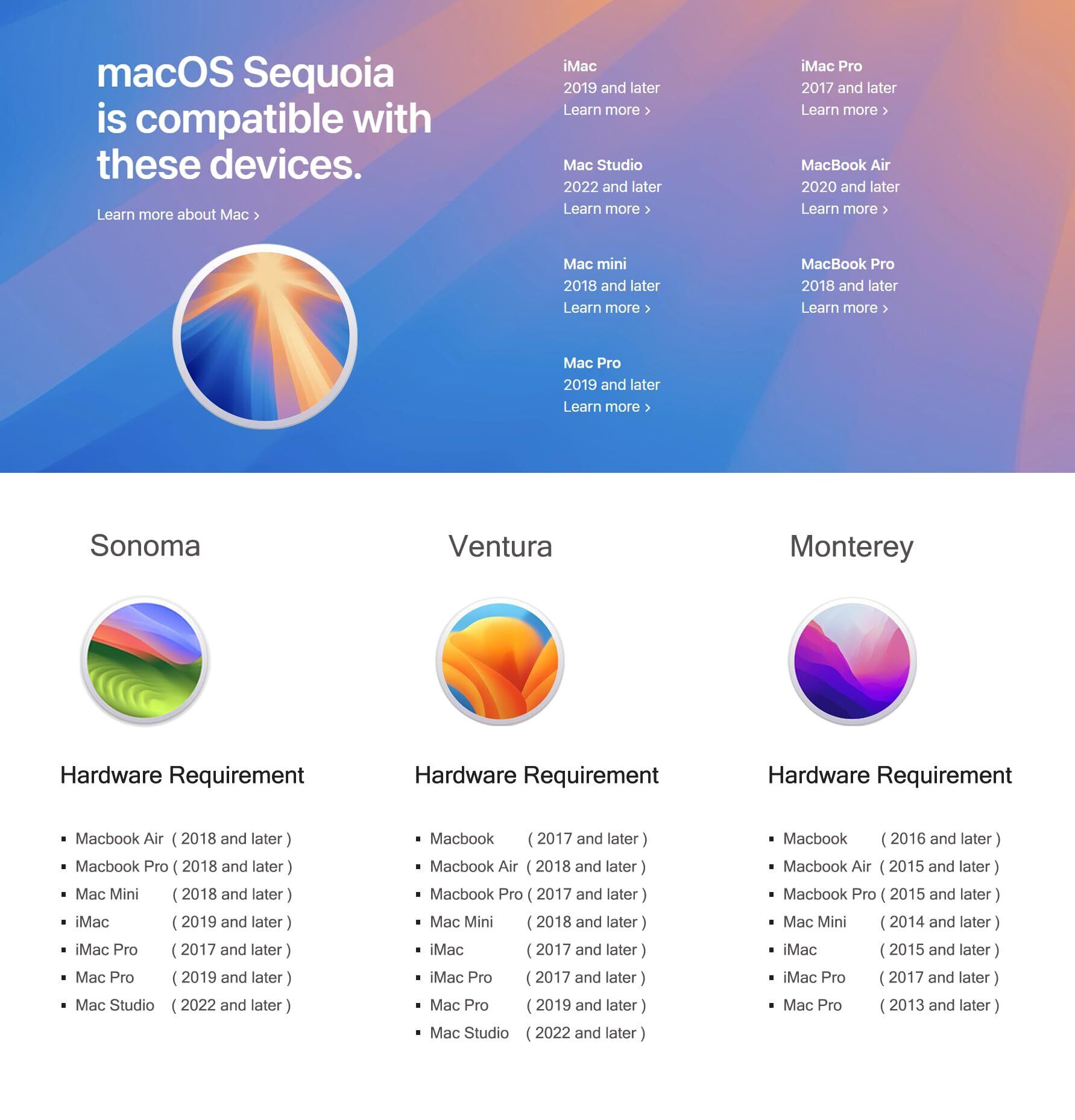 Sequoia 15、Sonoma 14、Ventura 13、Monterey 12.7