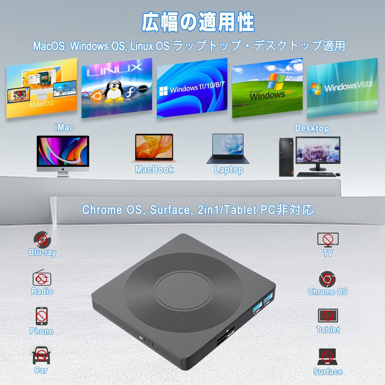 『非常に幅広い互換性』: ほぼすべてのMac OS、Linux OS、Windows OS(Windows11/10/8/7/XP/Vista...)のラップトップ、デスクトップ、オールインワンPCに対応できます。▲要注意: Chrome OS、2in1ラップトップ、タブレットPCには対応していません。パソコンに接続してからドライブが動作しない場合は、互換性の問題である可能性がありますので、別のパソコンでテストしてご確認してください。