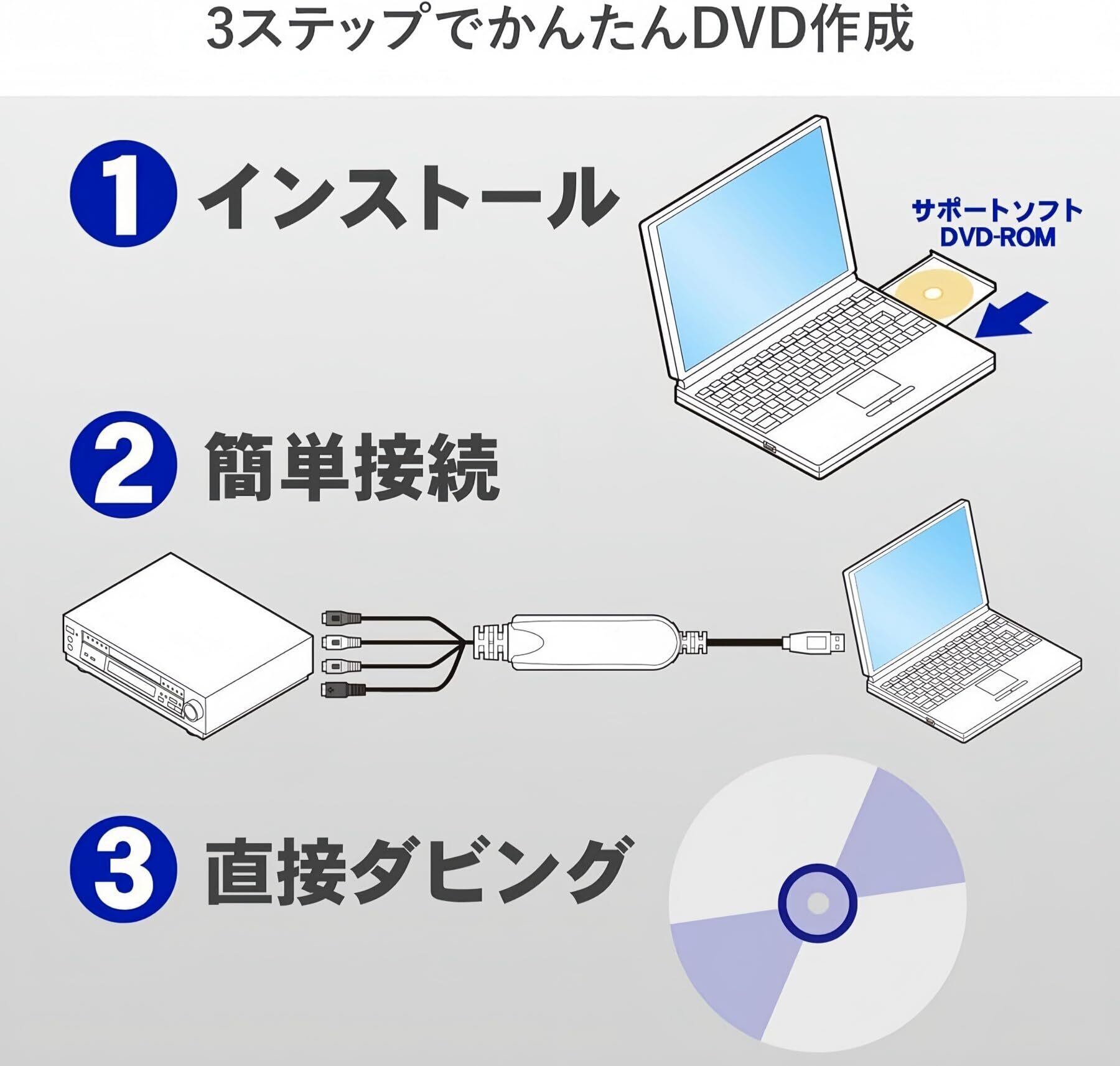 【初めてでも安心】使い始めの設定は、添付のCD-ROMを入れて1クリックでインストール完了。また、万が一使い方がわからなくても、DVDの作成、ハードディスクへの録画、簡単な編集方法がよくわかる「取扱説明書」を添付しているので、初心者の方にも安心です。