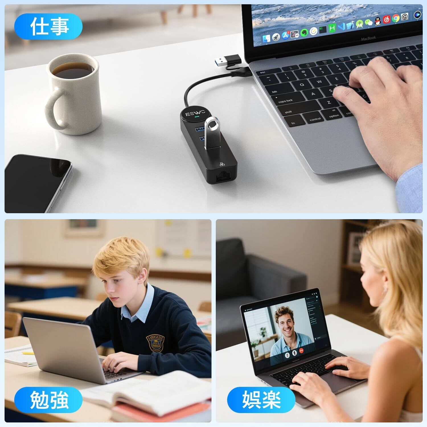 JESWO 2in1 USB C/USB A 有線LANアダプタ、USB 3.0*3 拡張 5Gbps超高速転送 10/100/1000Mbps 有線 LAN RJ45 ギガビット イーサネットアダプタ LEDライト付き iPad pro、Windows、Mac OS、iPad OS、Chrome OS、Linuxなどに対応 黒
