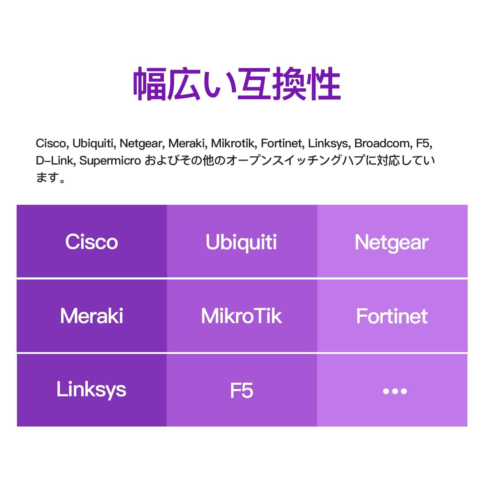 幅広い互換性: Cisco GLC-T/GLC-TE/SFP-GE-T, Ubiquiti UniFi UF-RJ45-1G, Meraki MA-SFP-1GB-TX, Mikrotik S-RJ01, Netgear AGM734, Broadcom, Supermicro およびその他のオープンスイッチングハプに対応しています。(注:HP/HPEスイッチとは互換性がありません)