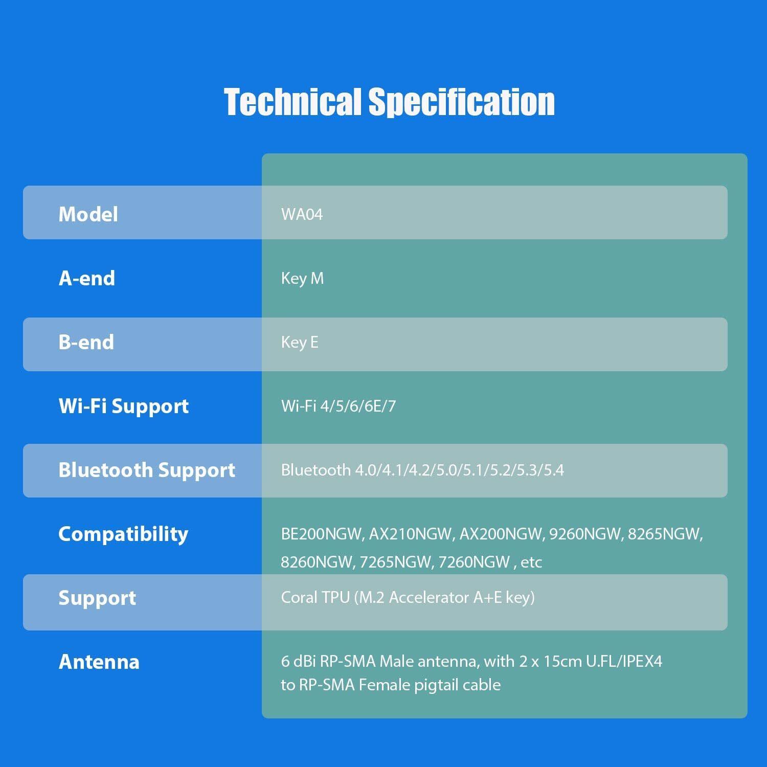 GLOTRENDS WA04 M.2 M Key - E Key WiFiアダプタ、M.2 WiFi 4/5/6/6e/7/Coral TPUモジュール用、3.5 dBi SMAアンテナ付属
