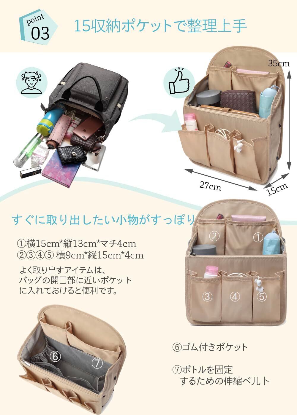 【様々な場所に大活躍】 作りがしっかりして多機能なので通勤の時だけでなく、買い物、ちょっとした旅行する時に収納バッグとしても大活躍です。携帯、手帳や化粧品など、すべての小物がきちんと直立して固定され、スムーズに取り出せます。
