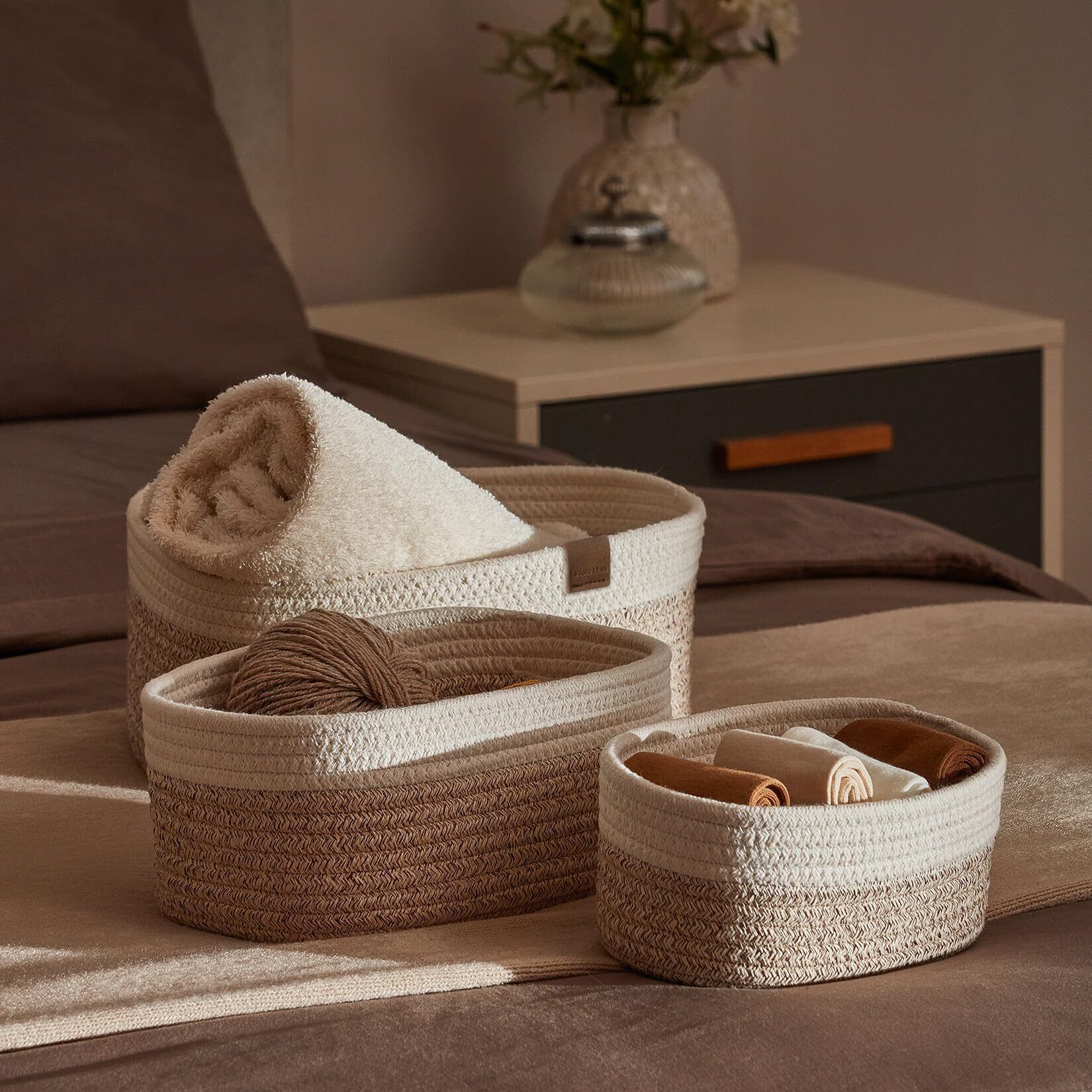 LA JOLIE MUSE 収納バスケット 北欧 カゴ 3点セット コットンロープ 編み込み 積み重ね ホワイト ライトブラウン