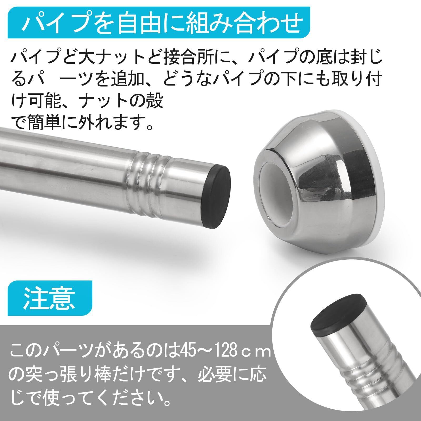 仕様】 伸縮パイプ×1、延長パイプ(短)×1、延長パイプ(長)×2、大ナット×1、小ナット×1。材質:ステンレス鋼。耐荷重:20kg~7kg。伸縮幅:45cm~128cm。日本語説明書付き。