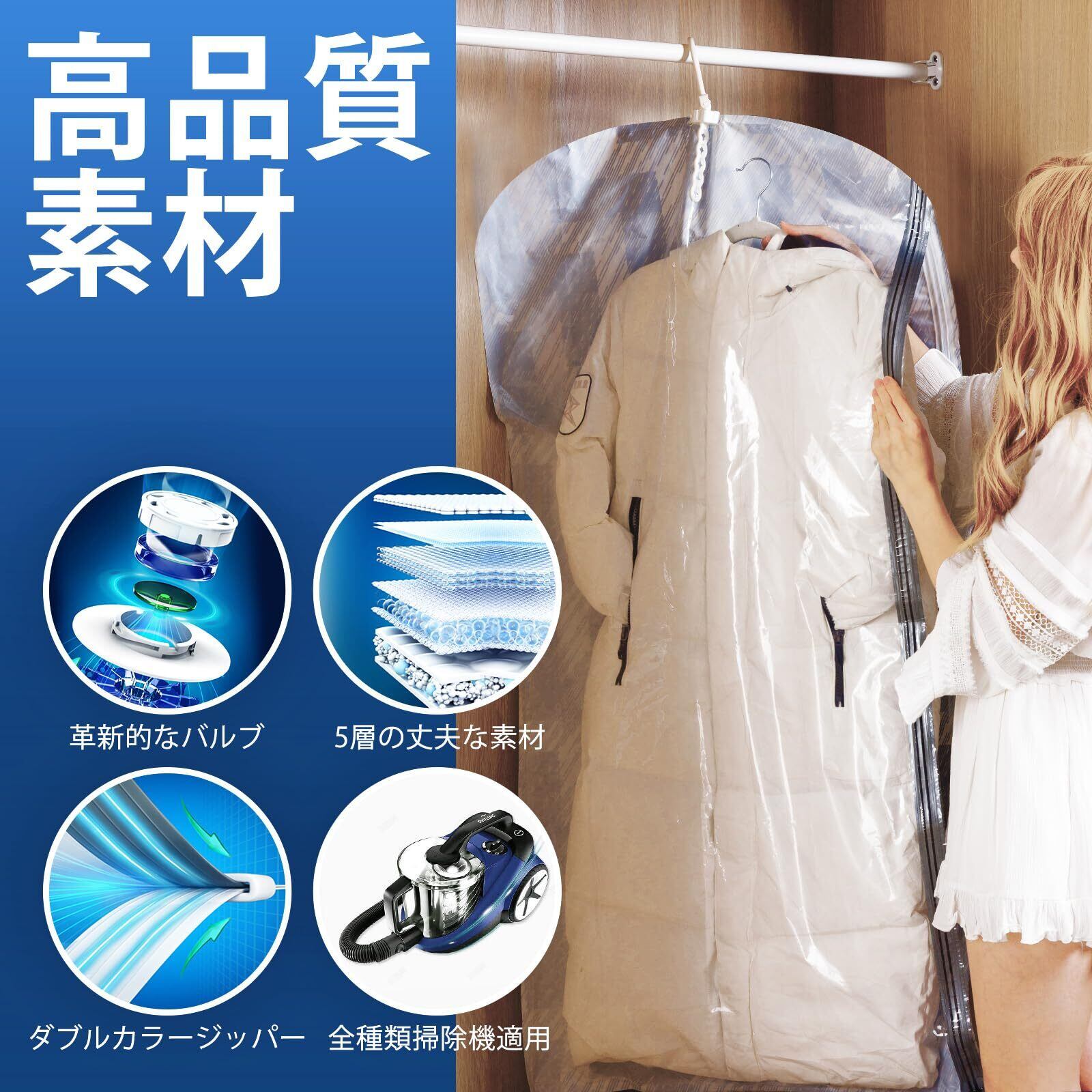 抜群なデザイン:5フック設計により、1枚のバッグに男女問わず5着のジャケットを収納できます。ドレスやオーバーコートも収納できます。圧縮袋にはダブルカラージッパーを採用し、スライダを装備し、ファスナーのシールを容易にし、色の変化によりファスナーが完全にシールされているかどうかを迅速に検査することができます