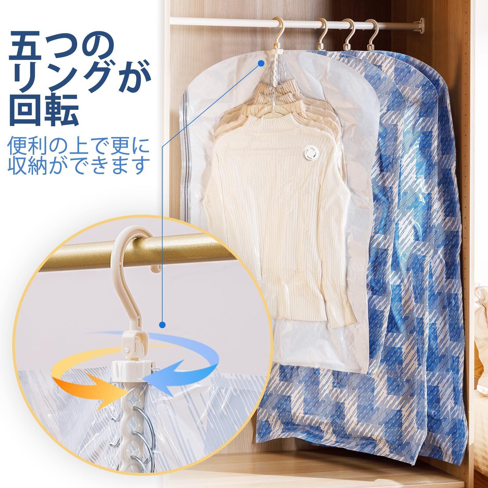 スッキリ収納:クローゼットに吊るして、衣類をすっきり収納できます。ジャケット、コート、洋服、スーツなど、散らかりやすい衣類をすっきり収納できる便利な吊り下げ式真空圧縮袋です。 ハンガーで、クローゼットに吊り下げて、服と一緒に管理できます。収納圧縮袋使わない時は折りたたんでコンパクトに収納出来ます