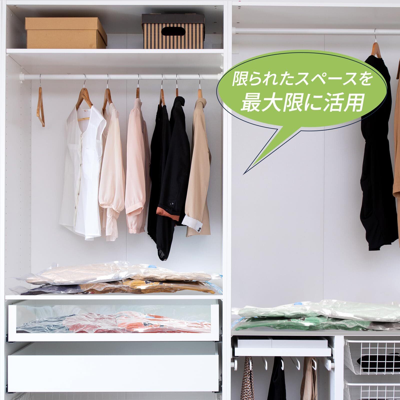 「省スペース!コンパクトに収納」季節の変わり目により、衣類や布団の切り替え、また日常や外出にも役立つ!しっかりと圧縮することで、衣類も布団もコンパクトにまとめられ、収納スペースを最大80%節約可能です。限られたスペースを最大限に活用し、クローゼットをスッキリ整理して家事の時短に!