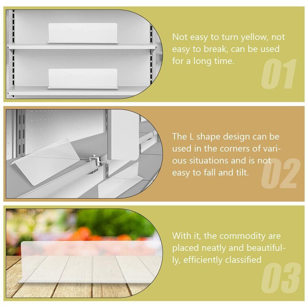 高い透明度のプラスチック素材:l字型の棚仕切り板は、高い透明度を持つプラスチック製で、商品を美しく見せ、整理整頓に役立ちます。