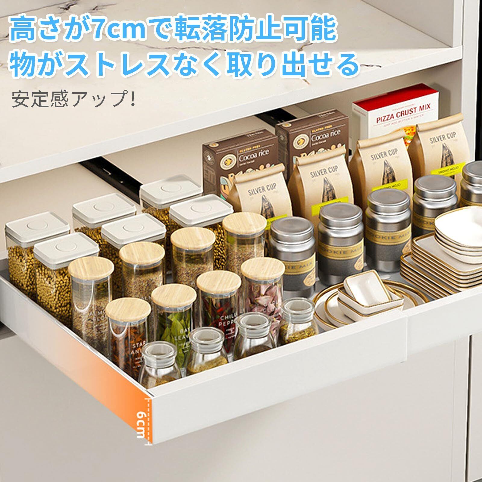 【スムーズなスライド式】このキッチン収納ラックは静かでスムーズに引き出せるので、奥のものでも手軽に取り出せます。複数の鋼球内蔵されたレールが3本にアップグレードされました!便利な取っ手も付いており、探しやすく取りやすいデザインです。高さ6cmで食品ストックの袋などもこぼれ落ちにくく、安心して使用できます。