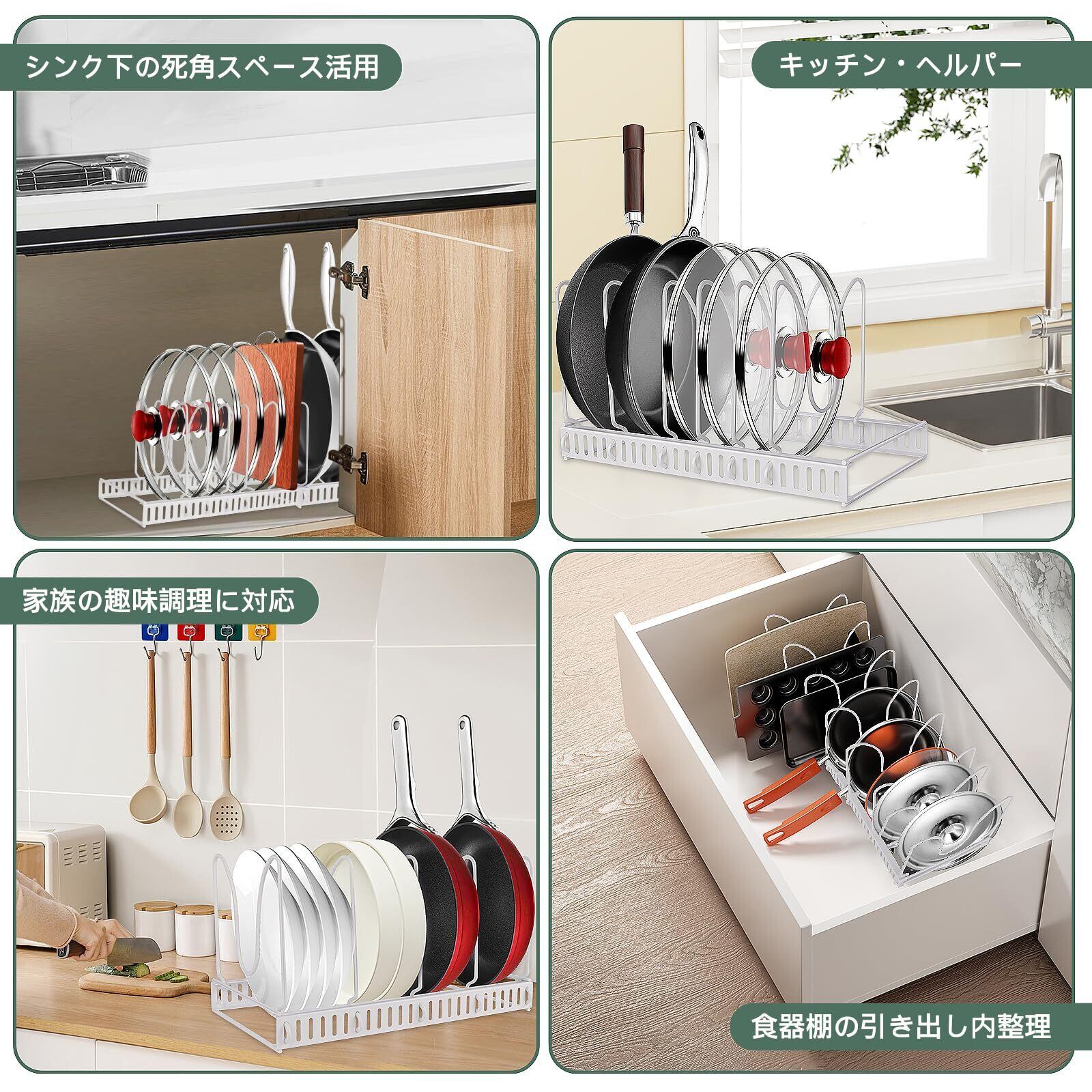 【仕切りでプロ級収納】 41~64cm無段階調節可能なフレームに、フライパン専用可動仕切りと鍋蓋/まな板固定トレーを10個装備。IHコンロ周りやシンク下の不規則なスペースでも、鋳物鍋から薄型クレープ鍋まで完璧整理。