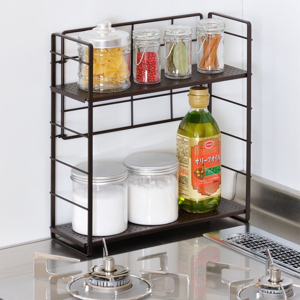 調味料やストックポットの整頓に便利。調理台やコンロの奥などに気軽に置けるスリムサイズです。棚板は置くものに合わせて高さ調節できます。