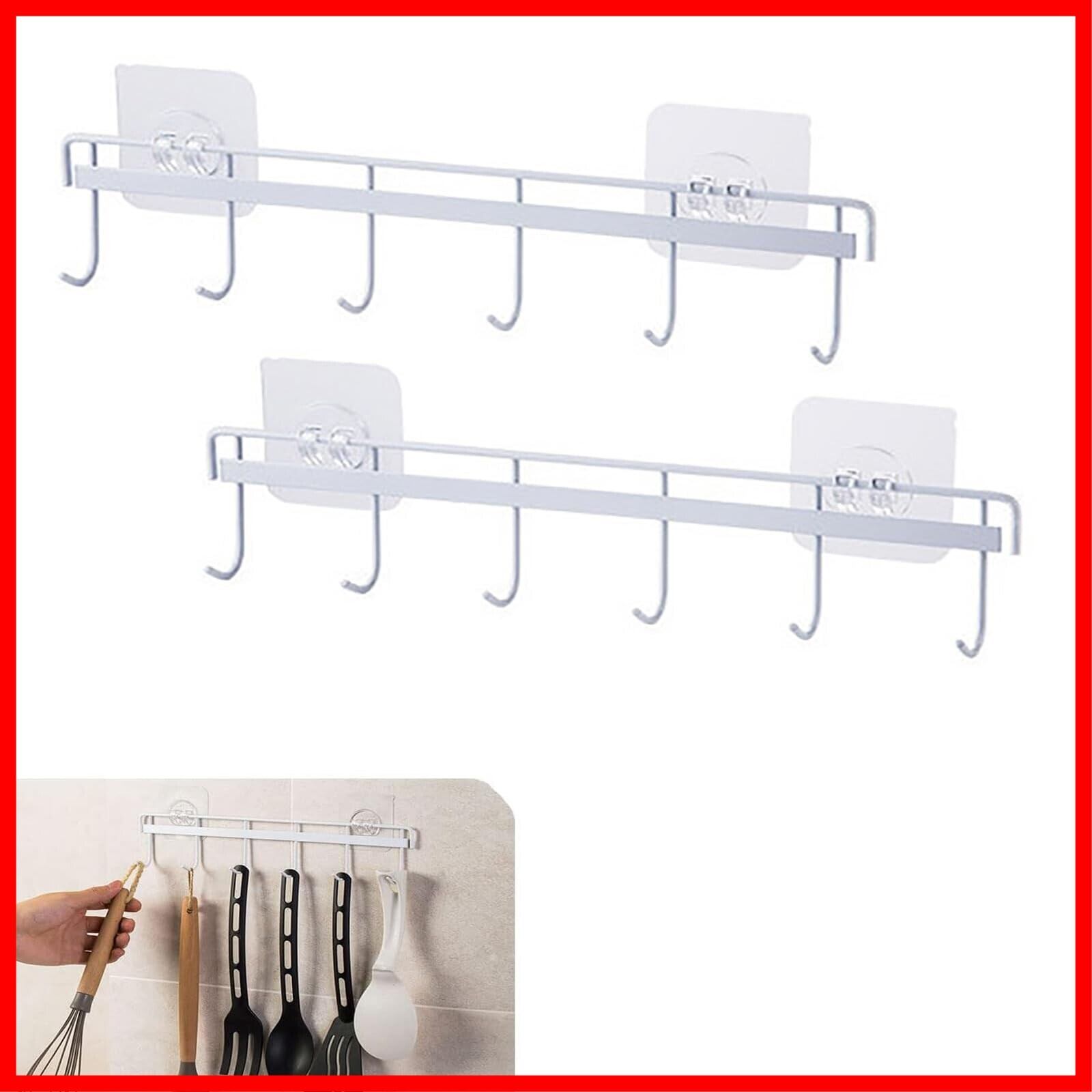 LEACAGR ( 2個入り)キッチンツールフック調理器具 キッチン収納 壁掛けフック強力粘着固定 穴あけ不要 壁 傷つけない キッチンツールステンレス 6個フック付き 防水 多機能収納フック 台所ラック幅32cm