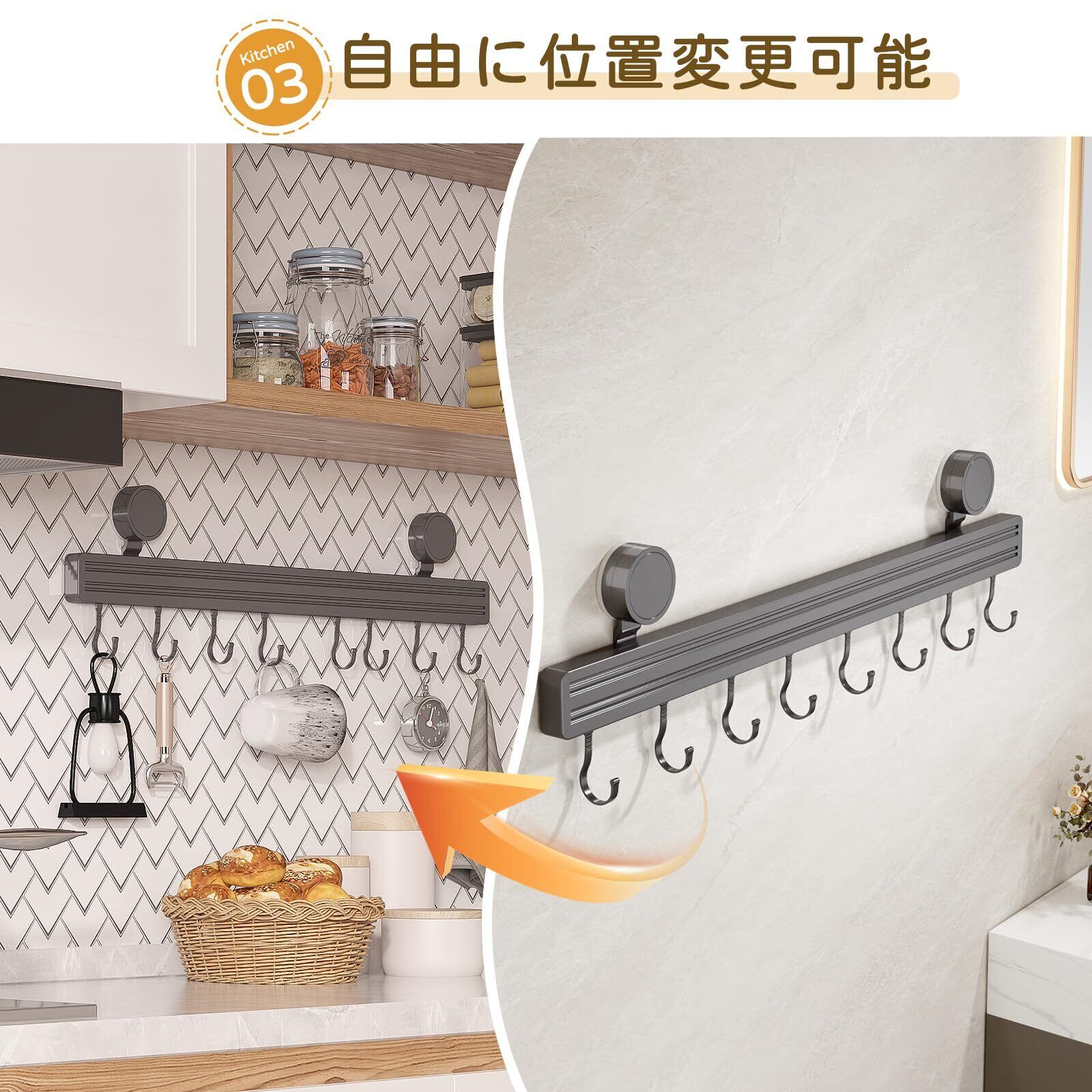 【在庫セール】SUOKOMR キッチンツールフック 壁掛けフック 粘着 強力吸盤 アルミニウム 防水防錆防油 軽量 穴あけ不要 台所 収納 調理器具 壁に穴を開けないフック バスルーム キッチン リビング ベランダなどに適用 40cm 8個フック マグネットフック(4個付き) | Cherry Blossoms