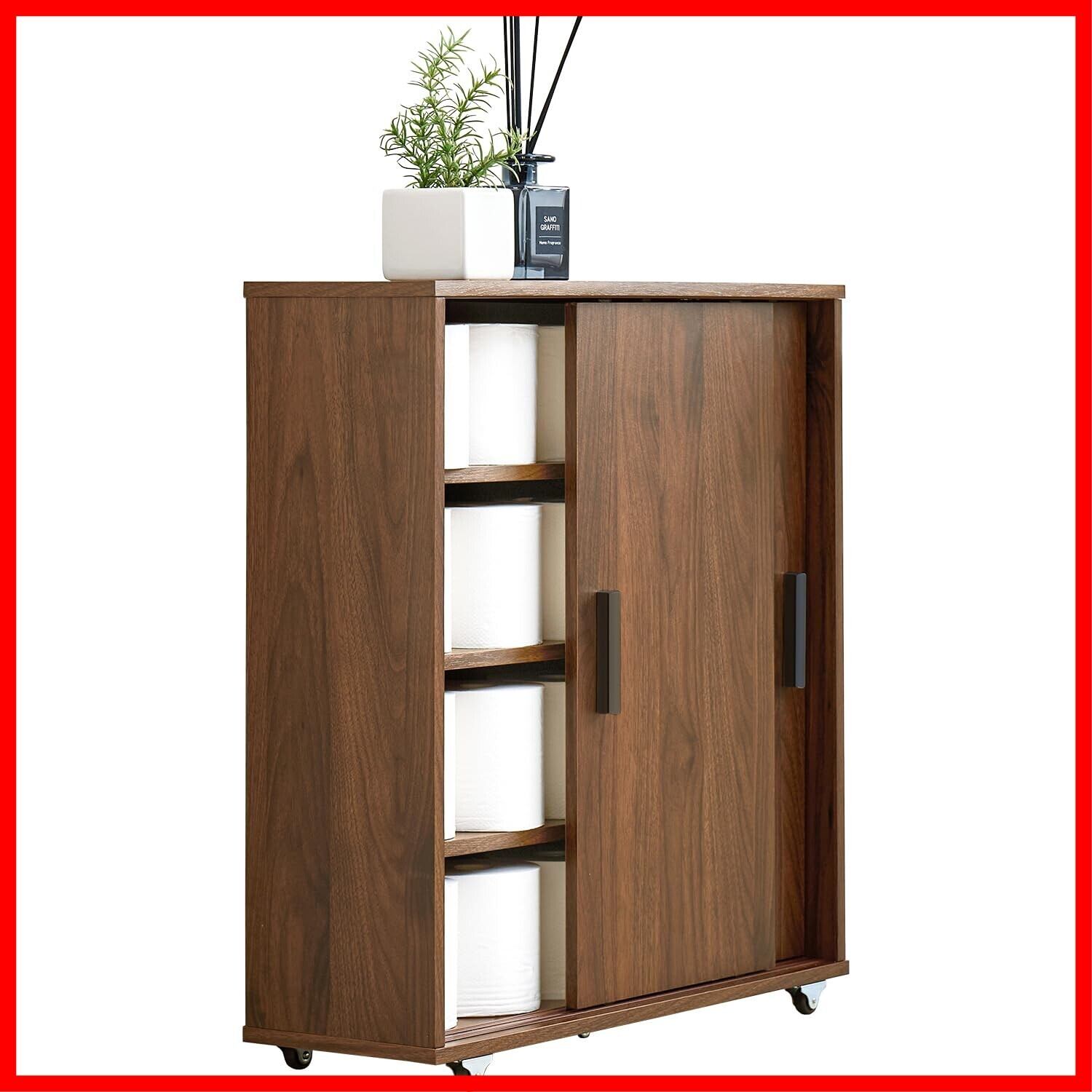 【数量限定】萩原 トイレラック 収納 スリム 洗面所収納 扉 棚板 取っ手 付き 引き戸 薄型 コンパクト キャスター付き 幅59 奥行19.5 高さ63 ブラウン RTR-1348BR | Cherry Blossoms