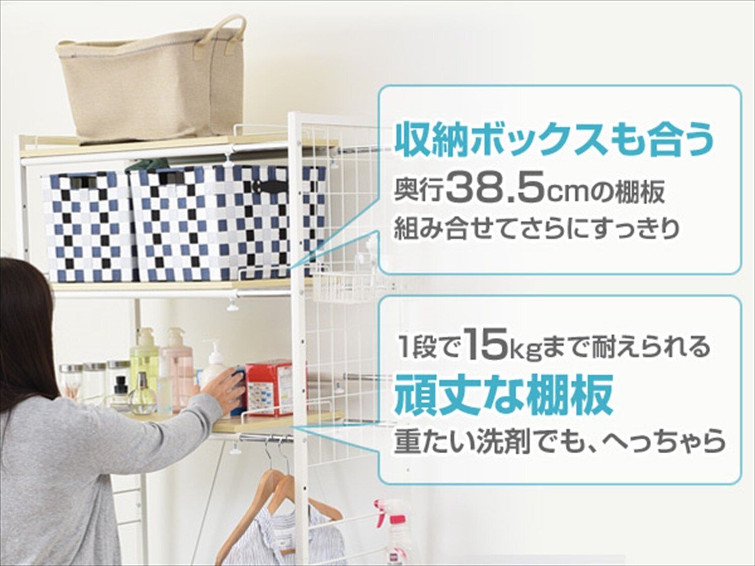 ●棚板は天板除いて2枚で、10cmピッチで調節可能br>●棚板・カゴ・フック・ハンガー部分と多種にわたる収納箇所があり、ごちゃつきがちなランドリー収納を一気にひとまとめ
