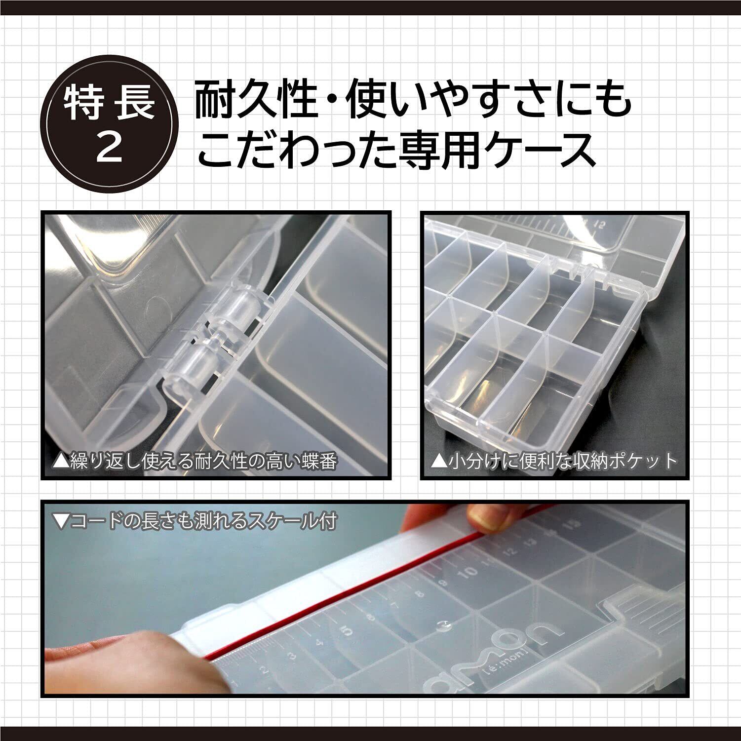■収納・整理に便利な透明ケース。ケースは予備ポケットもあり、フタに便利なスケール付き(15cm目盛り(目安))