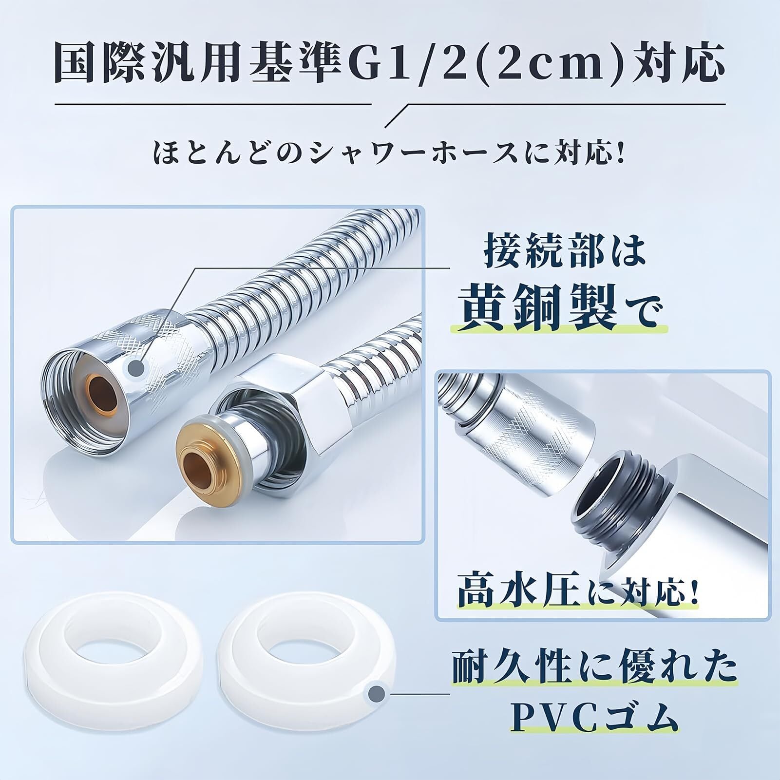 【耐久性抜群】シャワーホースの接続部はA級鍛造黄銅で精密加工されており、頑丈で耐久性に優れています。ネジサイズが国際標準G1/2(日本PJ1/2相当)で、接続が簡単です。ステンレス製外管とPVC内管の組合せにより、ホースは軽量と耐久性を両立させています。