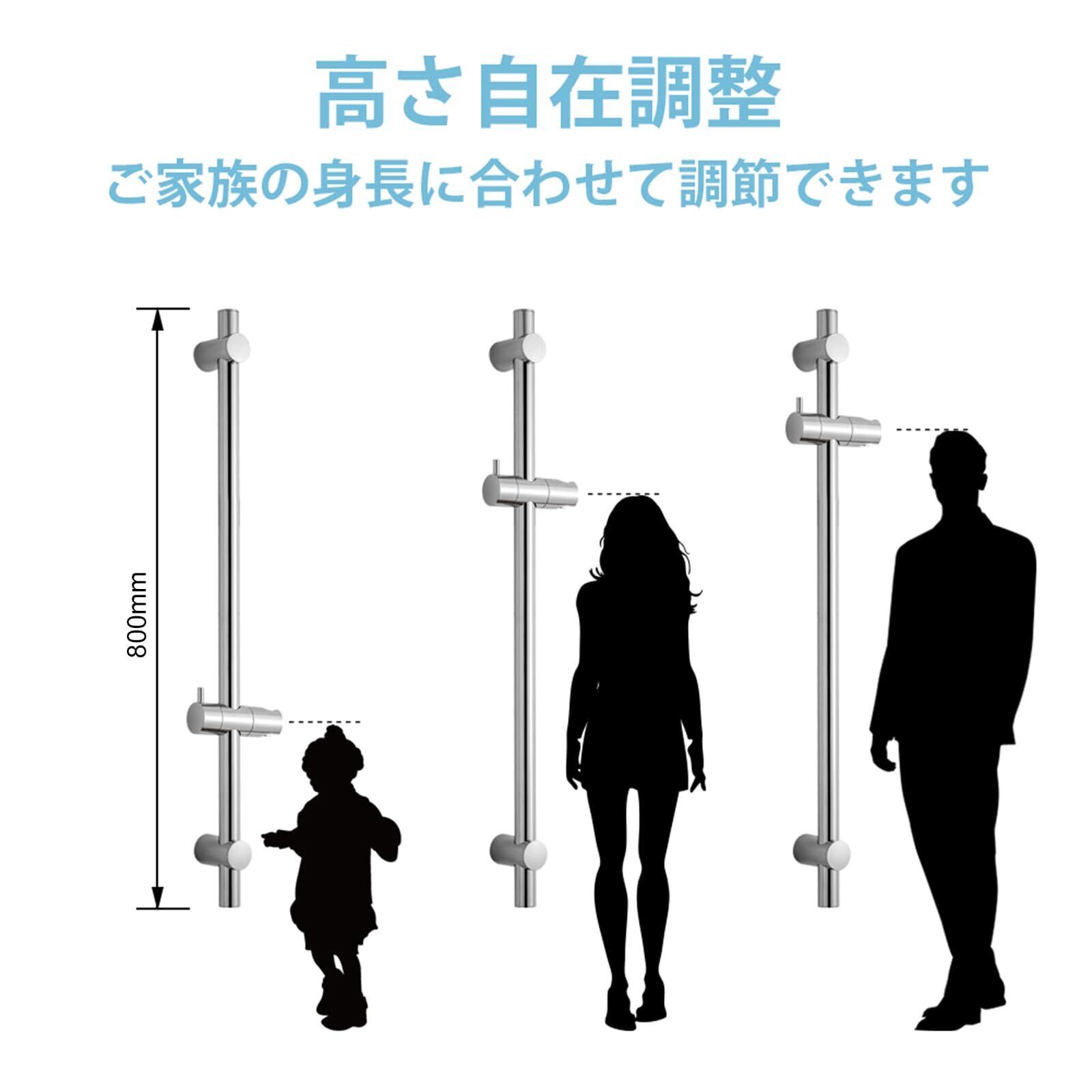 [高さ調整 角度調整] スライドバーの総長は820mmあります。フックを上下スライドさせてシャワーヘッドの高さを調整可能です。フックを回して散水角度を360°調整可能です。簡単なレバー一つの操作で個々の好みの高さ、角度でシャワーを使える為、家族様々に快適なバスタイムを作り上げます。