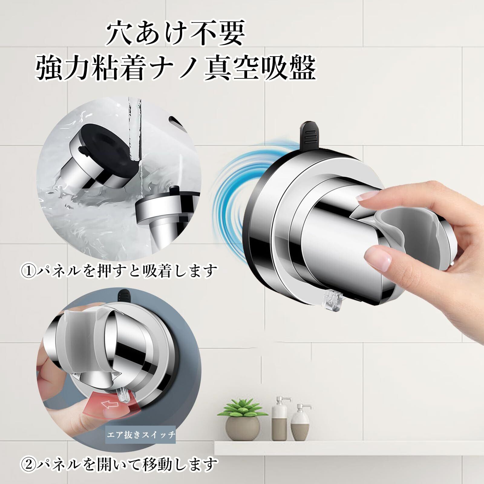 穴あけ不要・強力ナノ真空吸盤: このシャワーホルダー吸盤は穴を開ける必要がなく、取り付けが簡単で、高強度の真空吸盤デザインを採用し、陶器、ガラス、光沢のある金属などの滑らかな表面にしっかりと吸着し、迅速に取り付けが可能で、壁を傷めることがありません。
