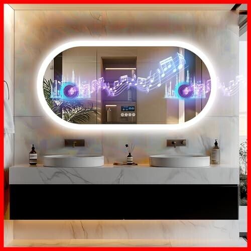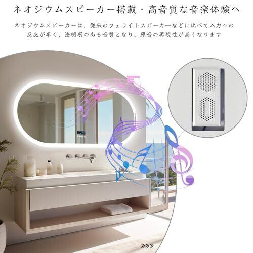 【音楽再生可能な洗面鏡!新登場】高音質なスピーカーを搭載している洗面鏡で、直接スマホなどと無線で接続し、音楽アプリと連動も可能で、化粧しながら音楽を高音質で楽しむことができます。家にも美容室・ヘアサロンにも大幅に応用できます