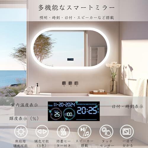 【デジタル時計付き】鏡面には時刻と日付、温度などが表示されているので、目を切らずに時間確認できます。洗面所に設置し、お忙しい朝に時間を見ながらゆっくりして髭剃りやメイクすることができます