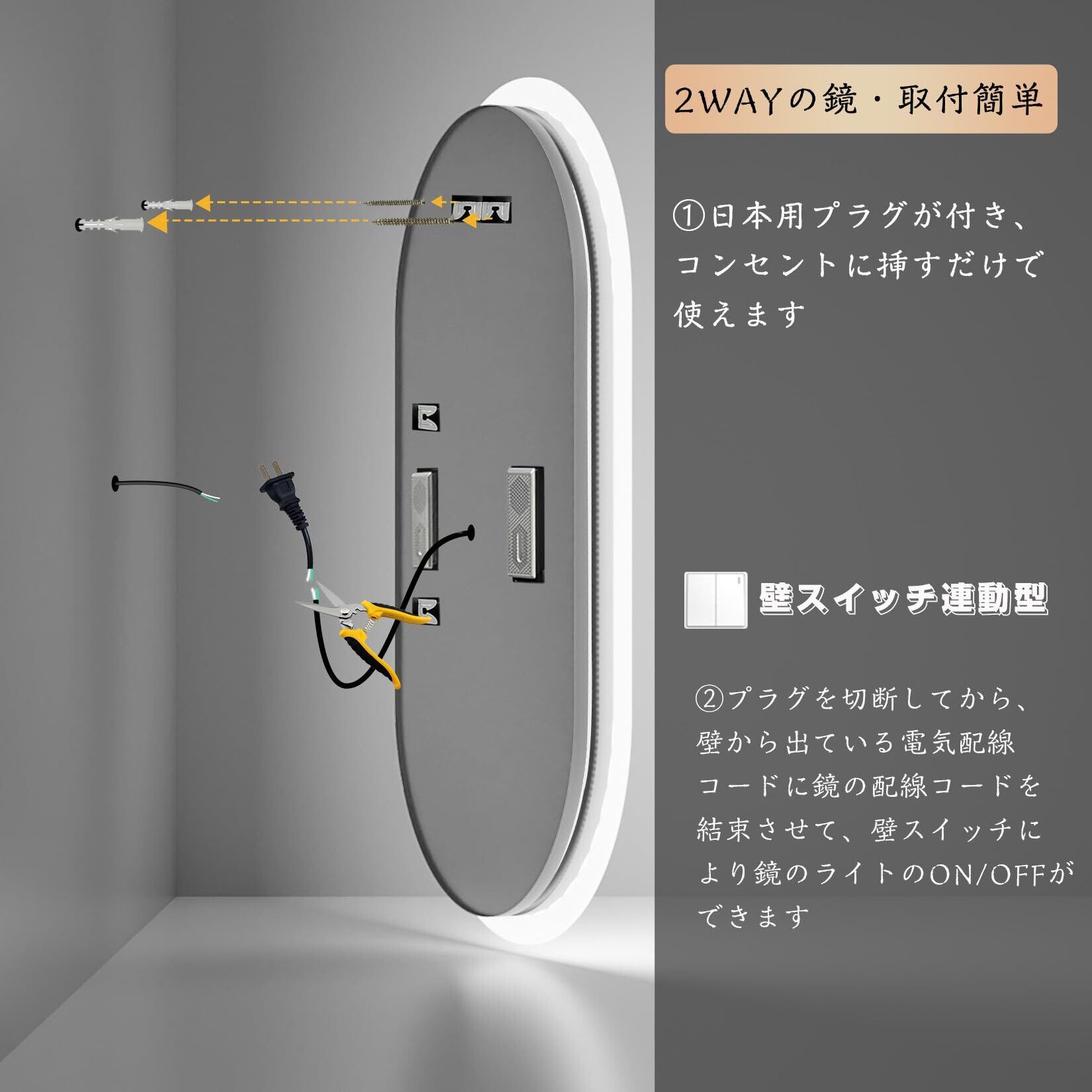 【設置簡単な壁掛け鏡】日本用プラグが追加された最新改良版で、組立完成品で届くため、コンセントに挿すだけなので業者に頼まなくても取り付けられます。ドレッサーや美容室の化粧鏡としても活用できます